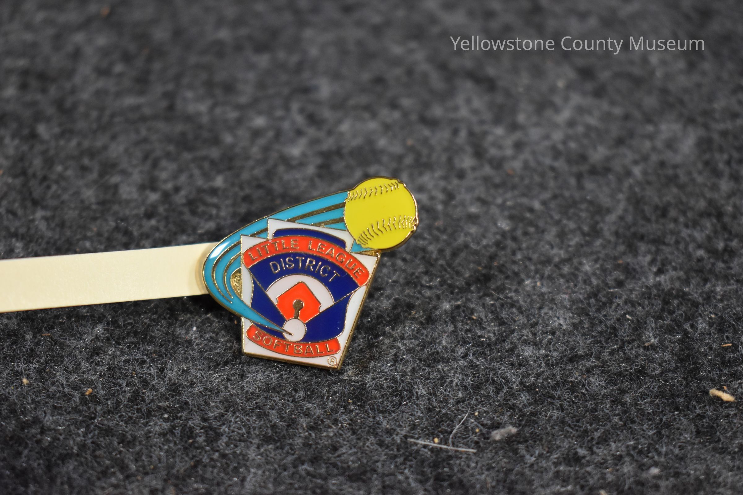 A red,white, and blue pin that is shaped like the Little League Baseball logo with a yellow/light green baseball in the upper right corner.Acquisition