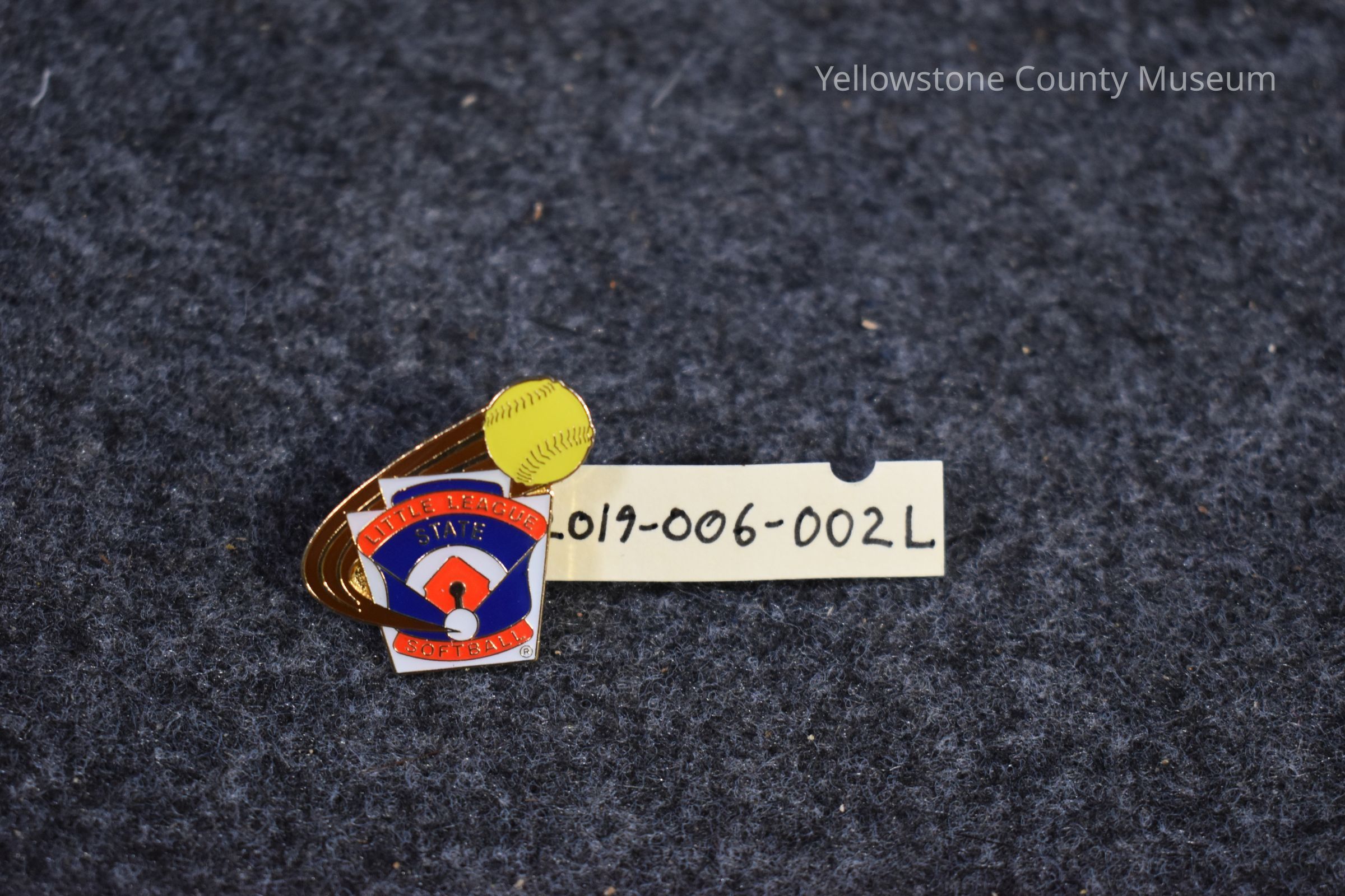 A pin that is shaped like a baseball diamond. The pin is red, white, and blue, with a yellow baseball in the upper righthand corner. The baseball diamond reads: "Little League State Softball."Acquisition