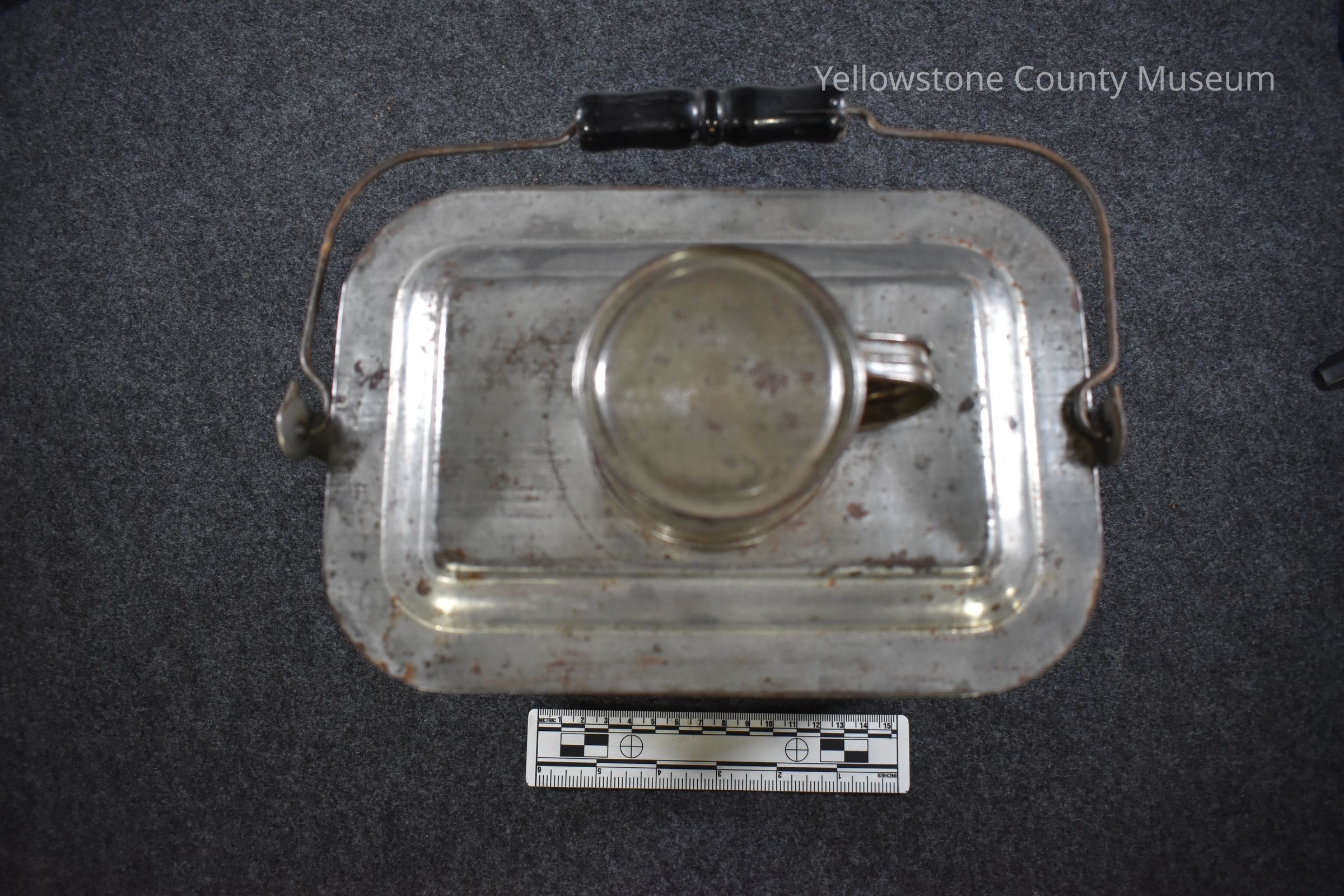 Gallon lunch pail "Double Decker" with cup on top, and detachable lid; donated by Evelyn Taylor. Tin, with some rust and scuff marks, dent on bottom.Acquisition