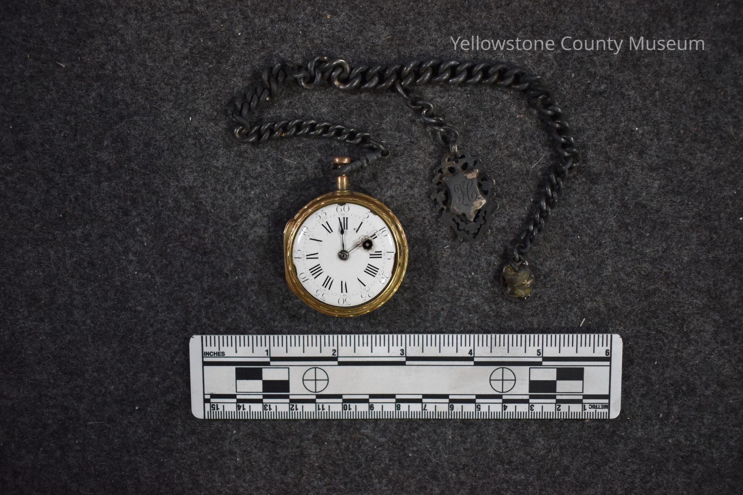 Man's gold colored watch attached to a heavy tarnished silver colored chain, 1890 (written on original label); the chain has a pendant labeled with an old English H.