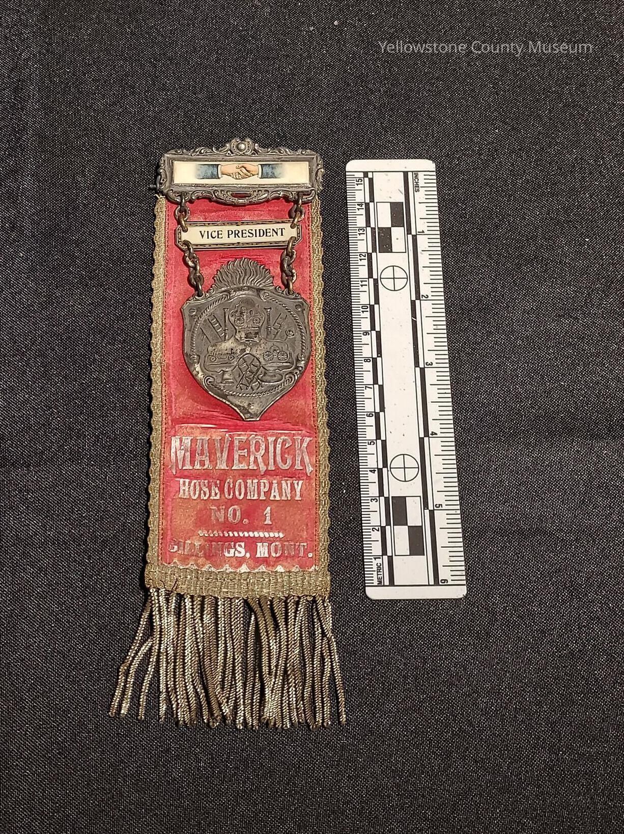 Red Ribbon Badge with metal piece showing two hands and ladders; badge indicates Vice President, Maverick Hose Co. No. 1Acquisition