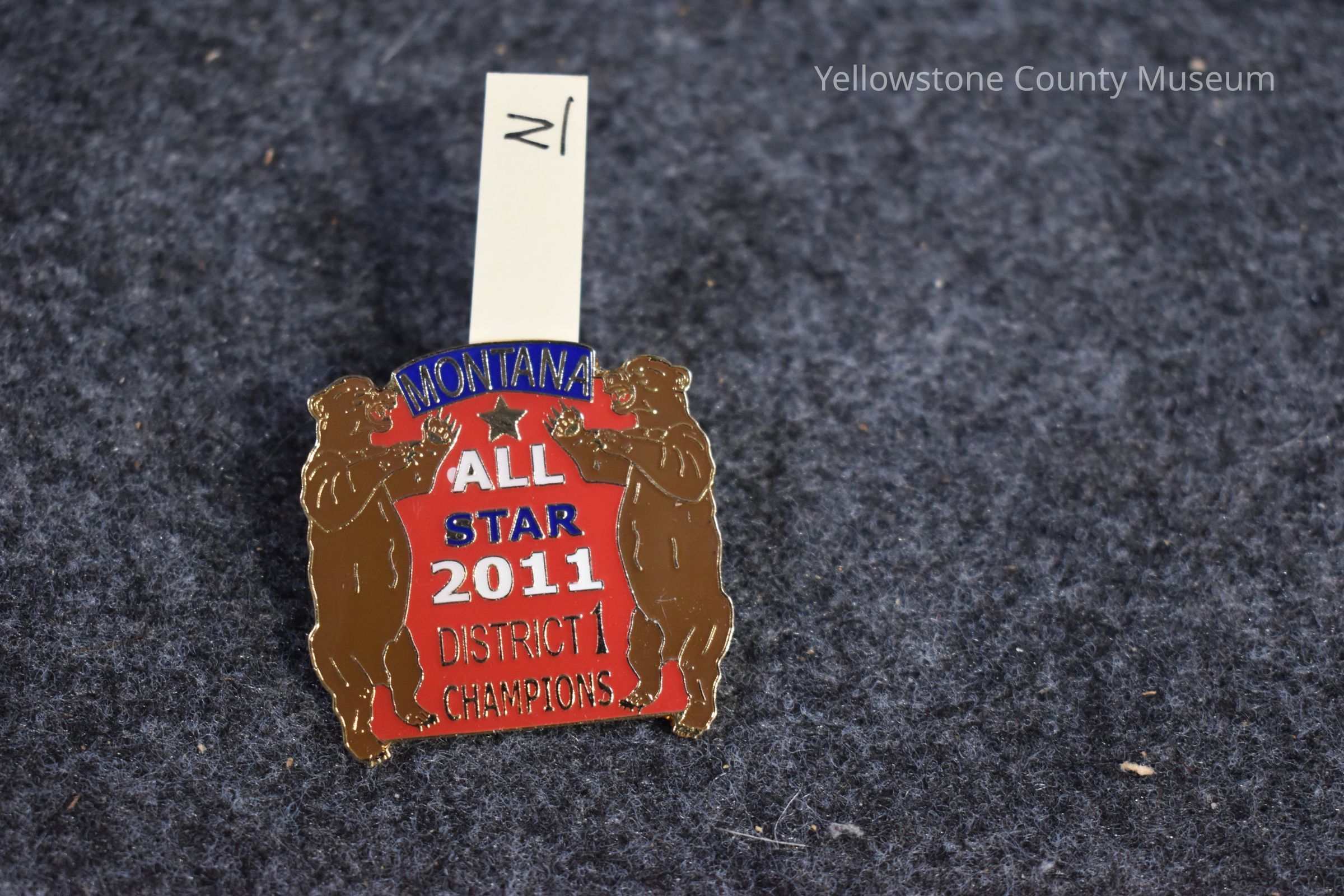 A pin with a red background and two brown bears on each side. The banner across the top is blue and reads: "MONTANA." The rest of the pin reads: All Star 2011 District 1 Champions.Acquisition