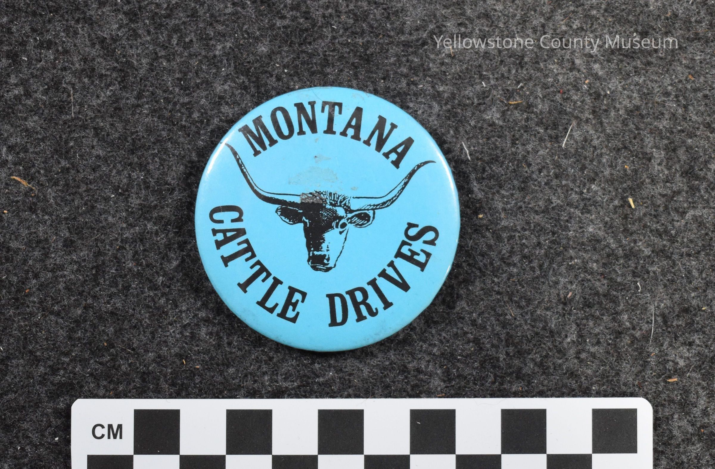 Front of pin is a sky blue color with at long horn cattle in the middle. Text on pin: "Montana Cattle Drives".Acquisition