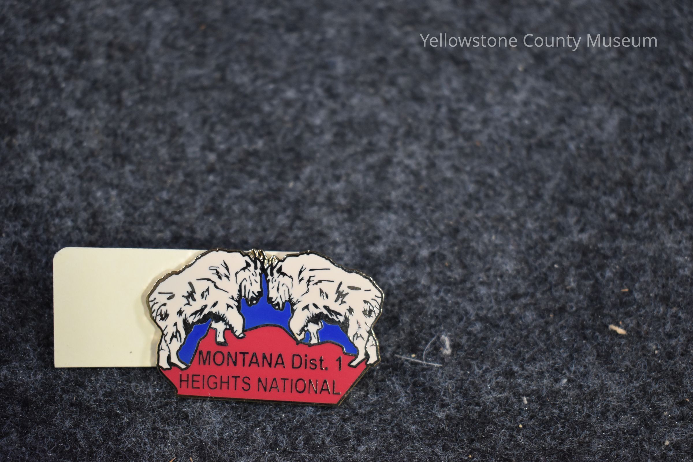 A baseball pin with a blue and red background with two white mountain goats facing one another. Under them on the red part of the background reads: "Montana Dist. 1 Heights National."Acquisition