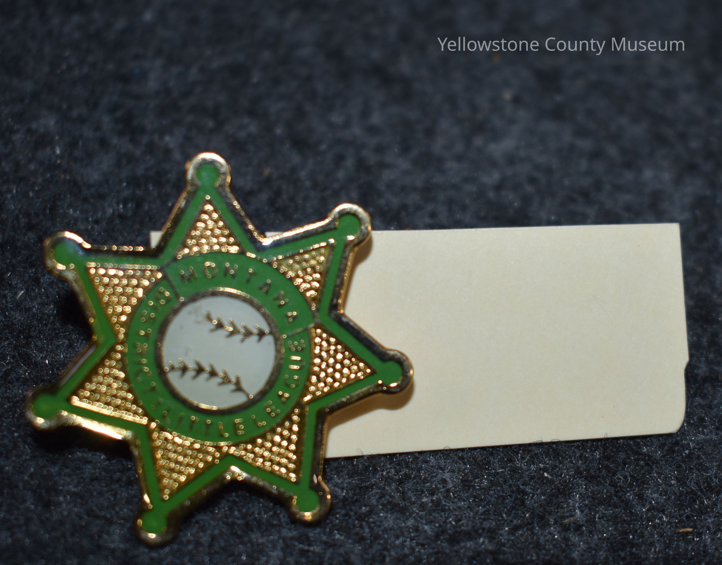 A Sheriff's badge star shabed pin that is gold with a green border. In the middle of the star is a baseball with a gold border. The baseball is slightly scuffed. Around the baseball reads: "Montana District 1 Little League."Acquisition