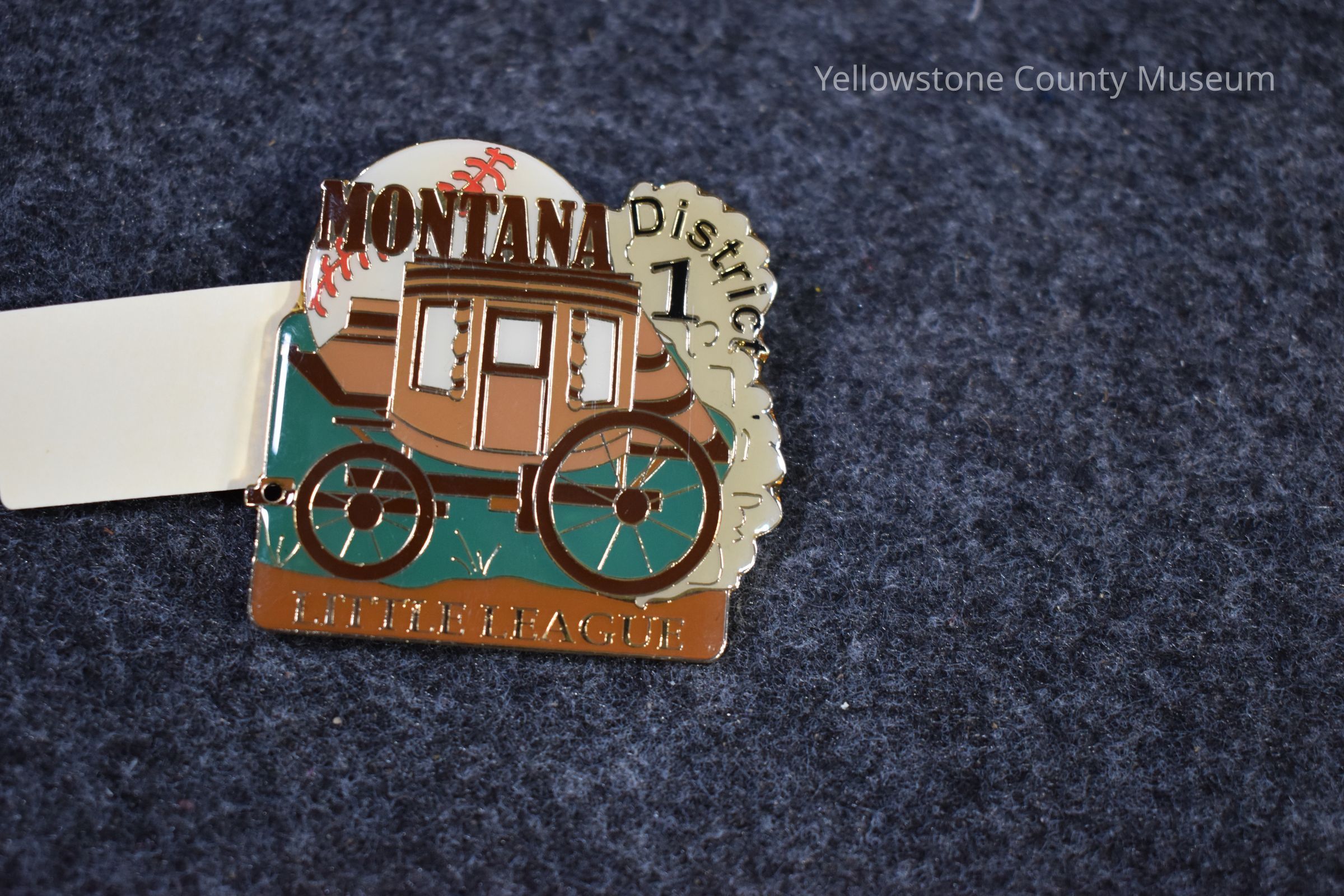 A pin that is shaped like a horse-drawn wagon with a baseball in the background. The wagon is various shades of brown and driving over a brown road while kicking up dust. 1 in a 3 piece set.Acquisition