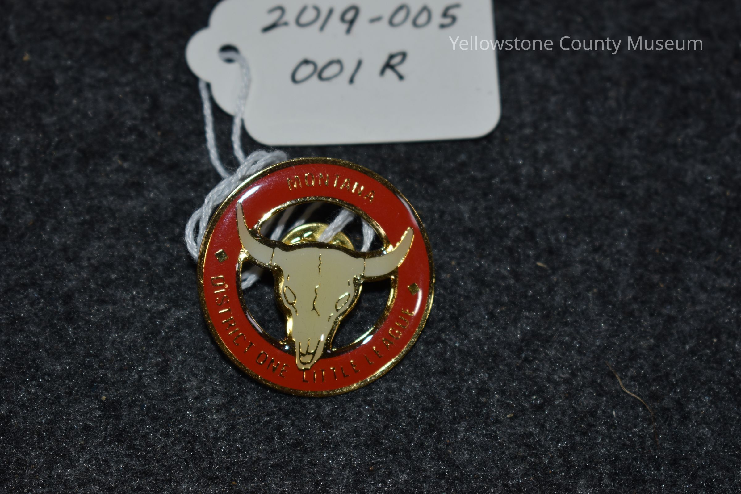 A round pin that has a red border and a bull skull in the middle. The border reads "Montana District One Little League" in gold lettering.Acquisition