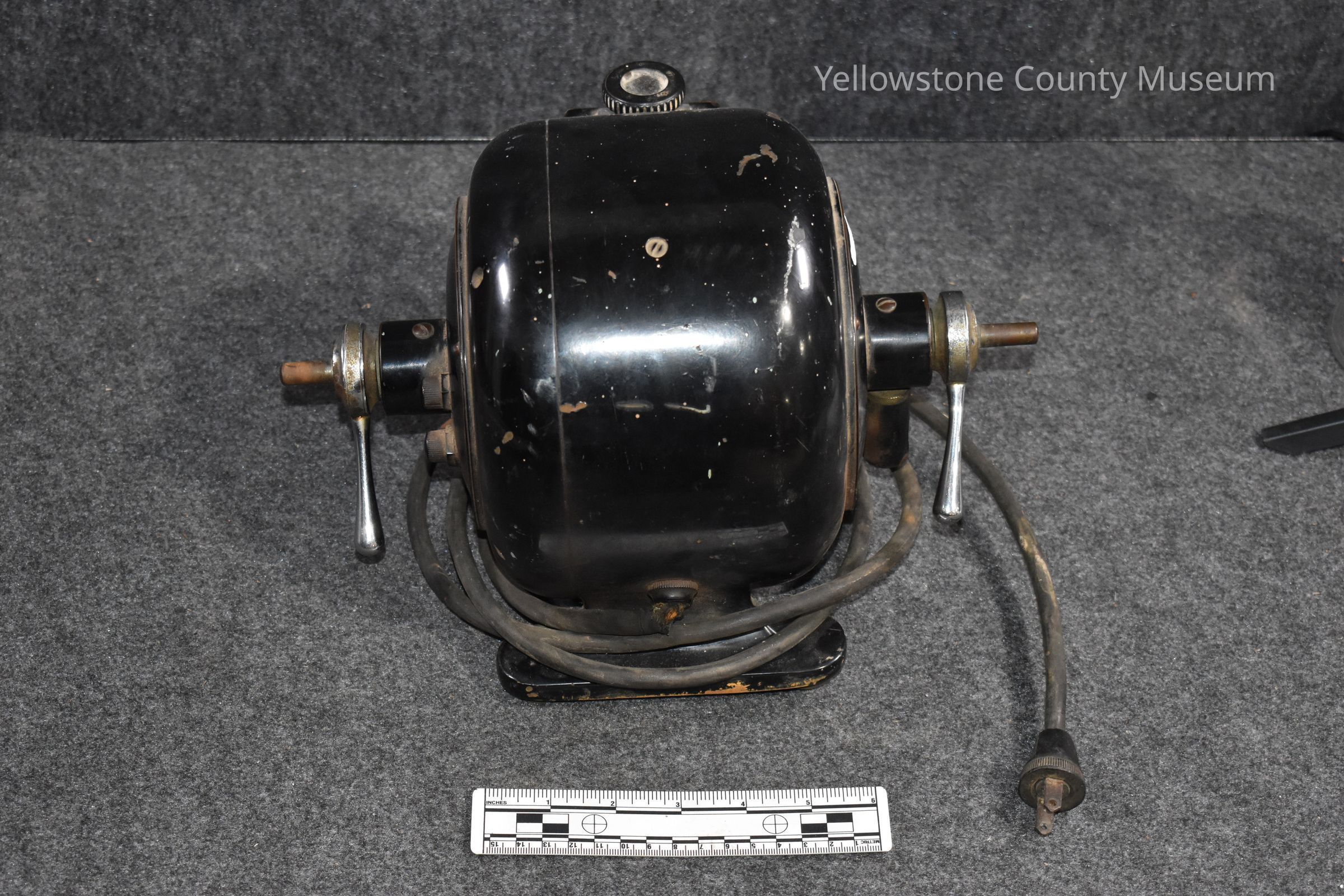 A black motor, likely used in a lab or shop; the motor has a long power cord; on either side are knobs; on the front is an adjustable knob and a face plate that reads: "Ritter Laboratory Motor."Acquisition