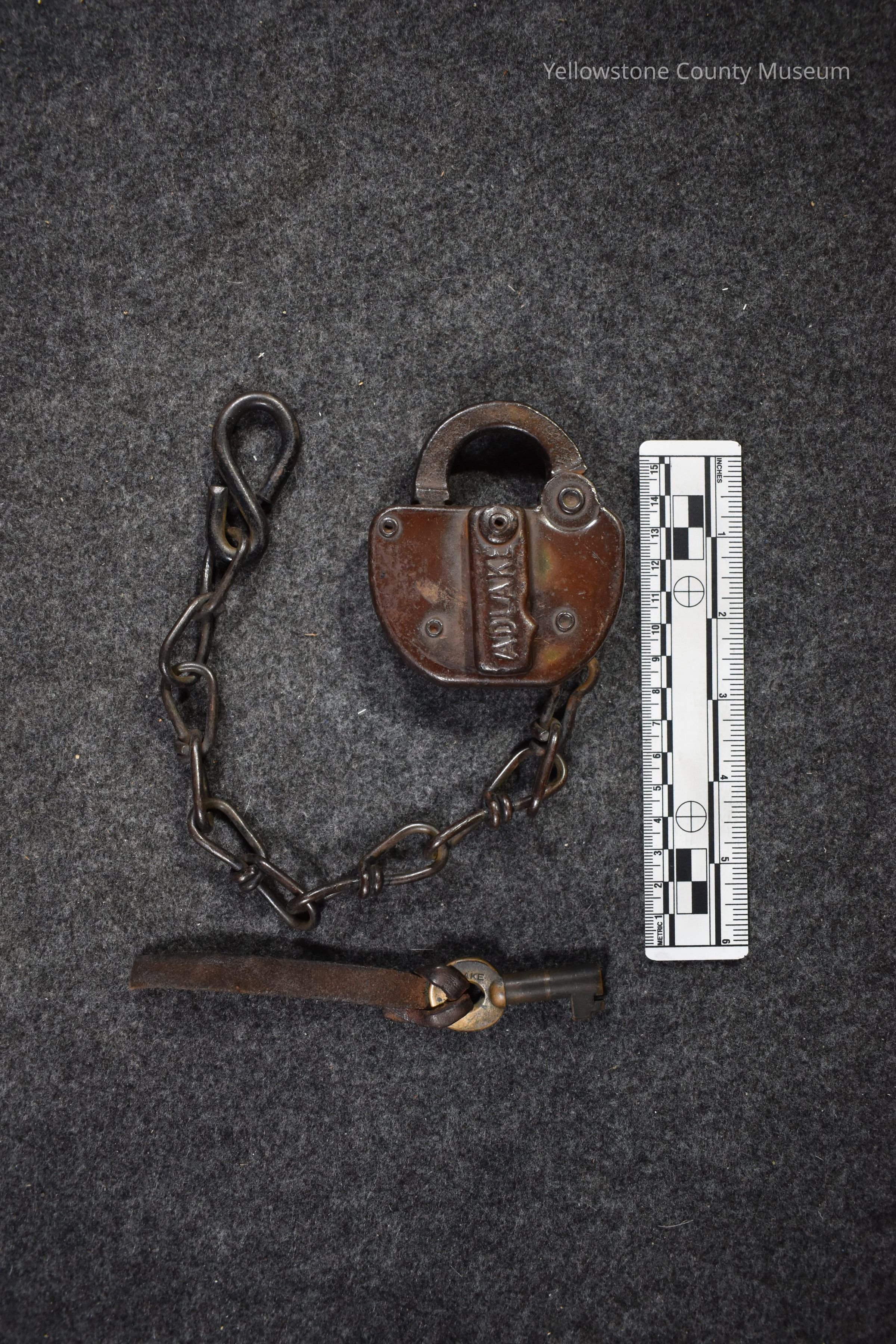Northern Pacific Railway metal switch lock on chain with key. Text on front of lock, "ADLAKE" and when you slide the key cover the numbers "343" are engraved. Text engraved on the back of the lock, "NORTHERN PACIFIC SWITCH PAT MAR. 20. 1920". Key has a leather lanyard. Engraved on key, "N.P.RY" and "ADLAKE"Acquisition