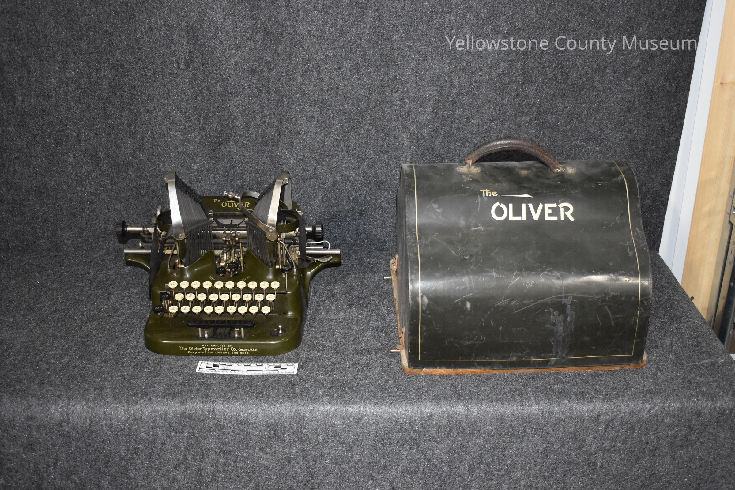(510b, 510-2) Oliver Typewriter and Case, 1895 circa. Oak wood base for the case was split and broken into 4 pieces. In 2022, the minimal amount of Titebond II, wood glue, was applied to salvage the base.Acquisition