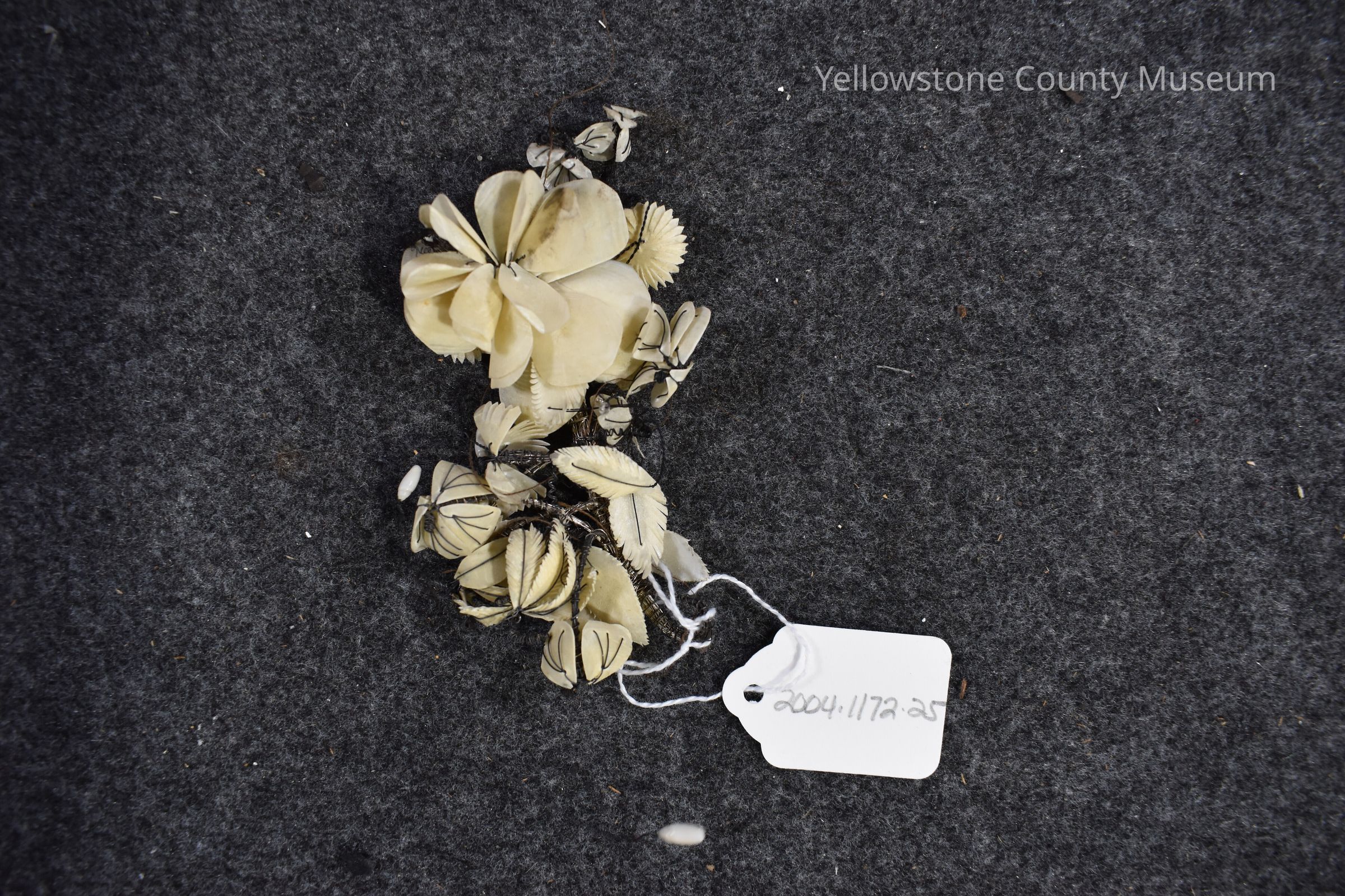 Handmade floral hair ornament; pieces of shell wired.