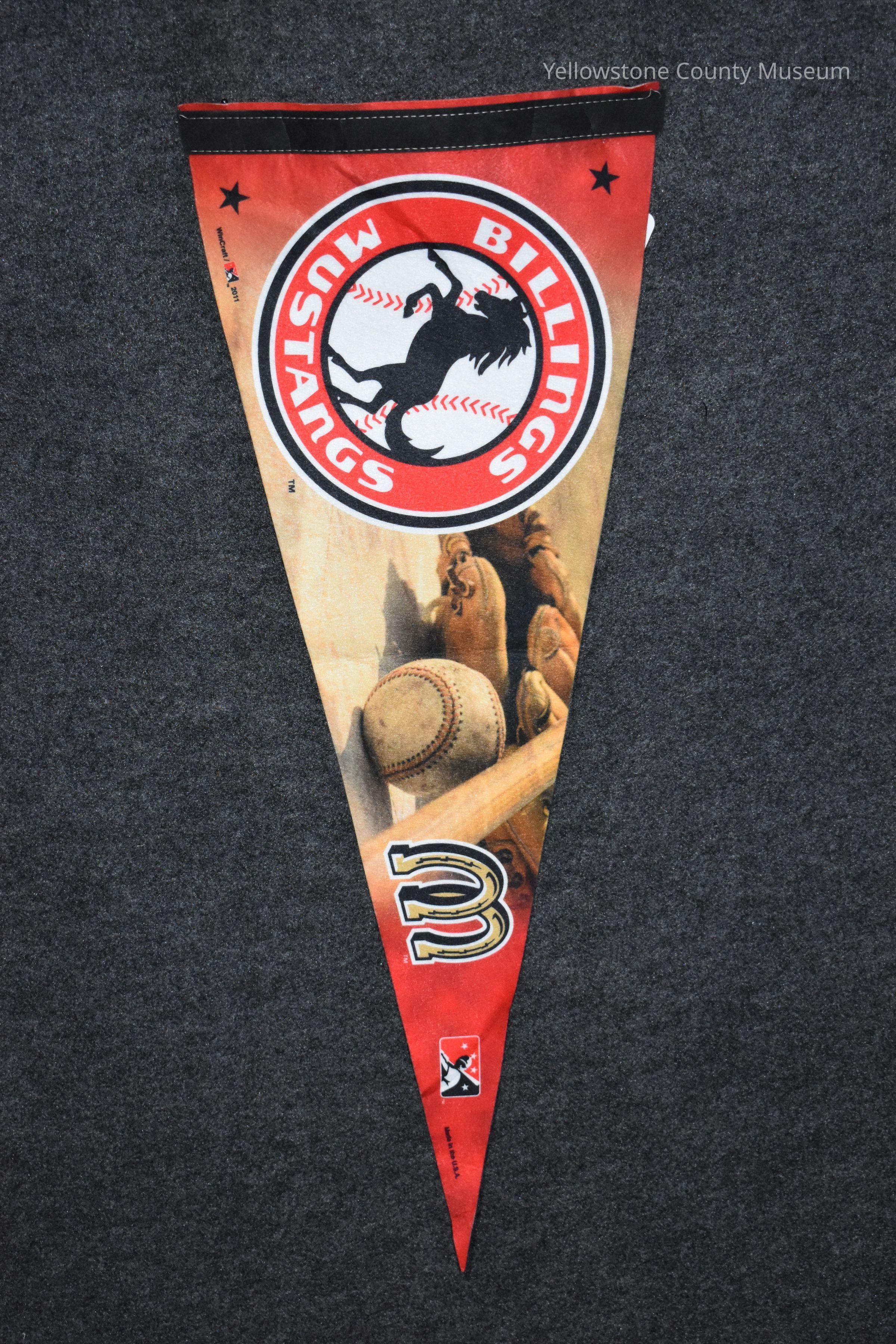 A pennant flag for the Billings Mustangs; the flag is an isosceles triangle in shape, and has a field of red and a photographic image of a baseball and part of a bat and mitt; on the wider end is the Billings Mustangs logo which consists of a rearing horse on a baseball backdrop with concentric circles of red, black, and white; on the tapered side is an "M" in the shape of two upside-down horseshoes.Acquisition