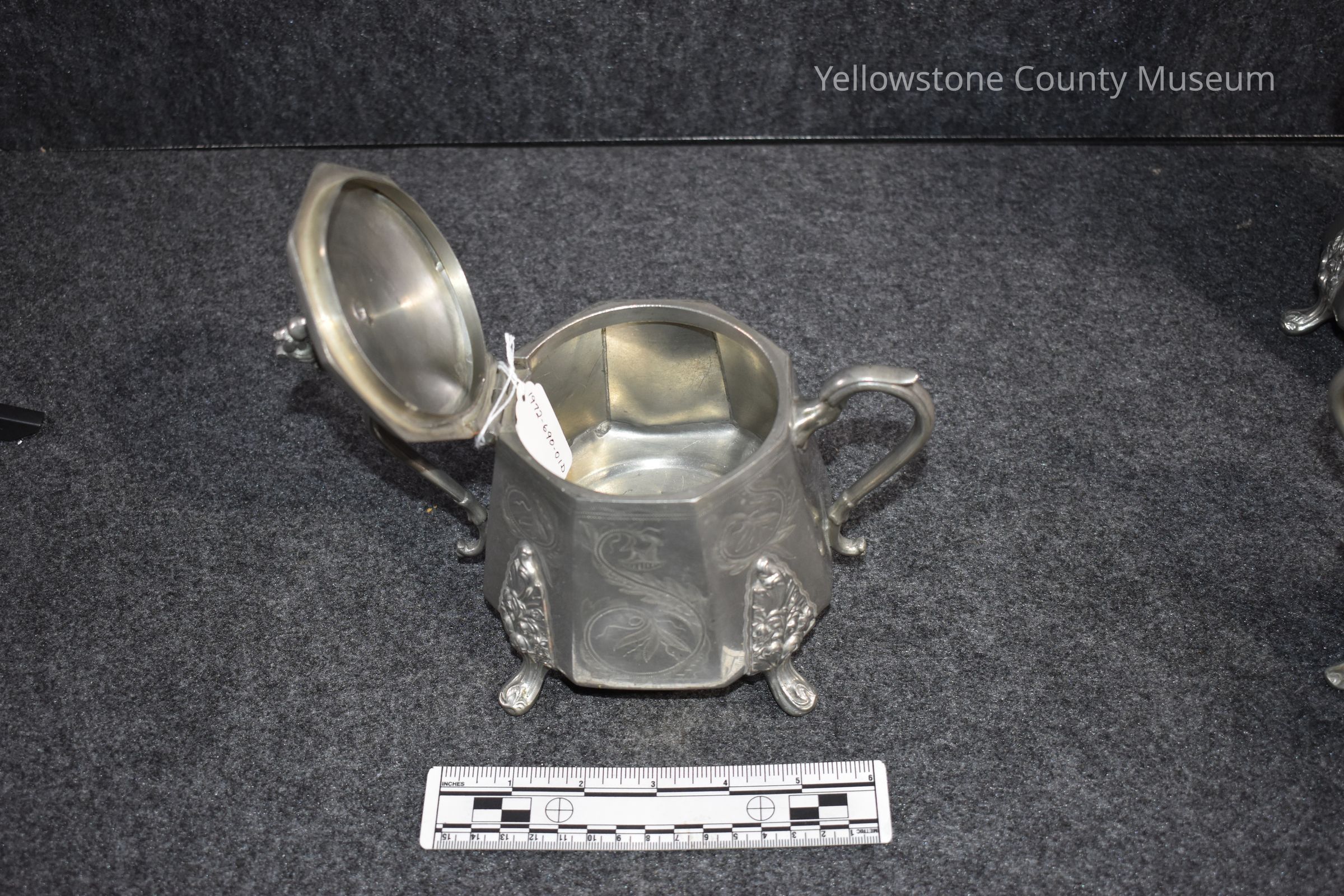 Description card states: Pewter coffee & tea pot, creamer & sugar bowl; In memory of the late Mr. & Mrs. George W. Haskell, who came to Billings in 1912. Donated by W.H. McCallie and Miss Gertrude Haskell.Acquisition