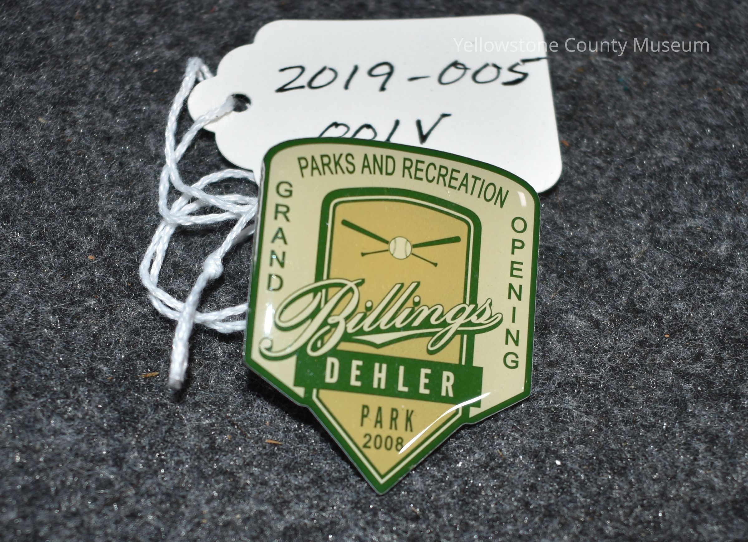 A pin celebrating the opening of Dehler Park. The pin is two shades of tan with green borders. in states: "Parks and Recreations Grand Opening Billings Dehler Park 2008."Acquisition