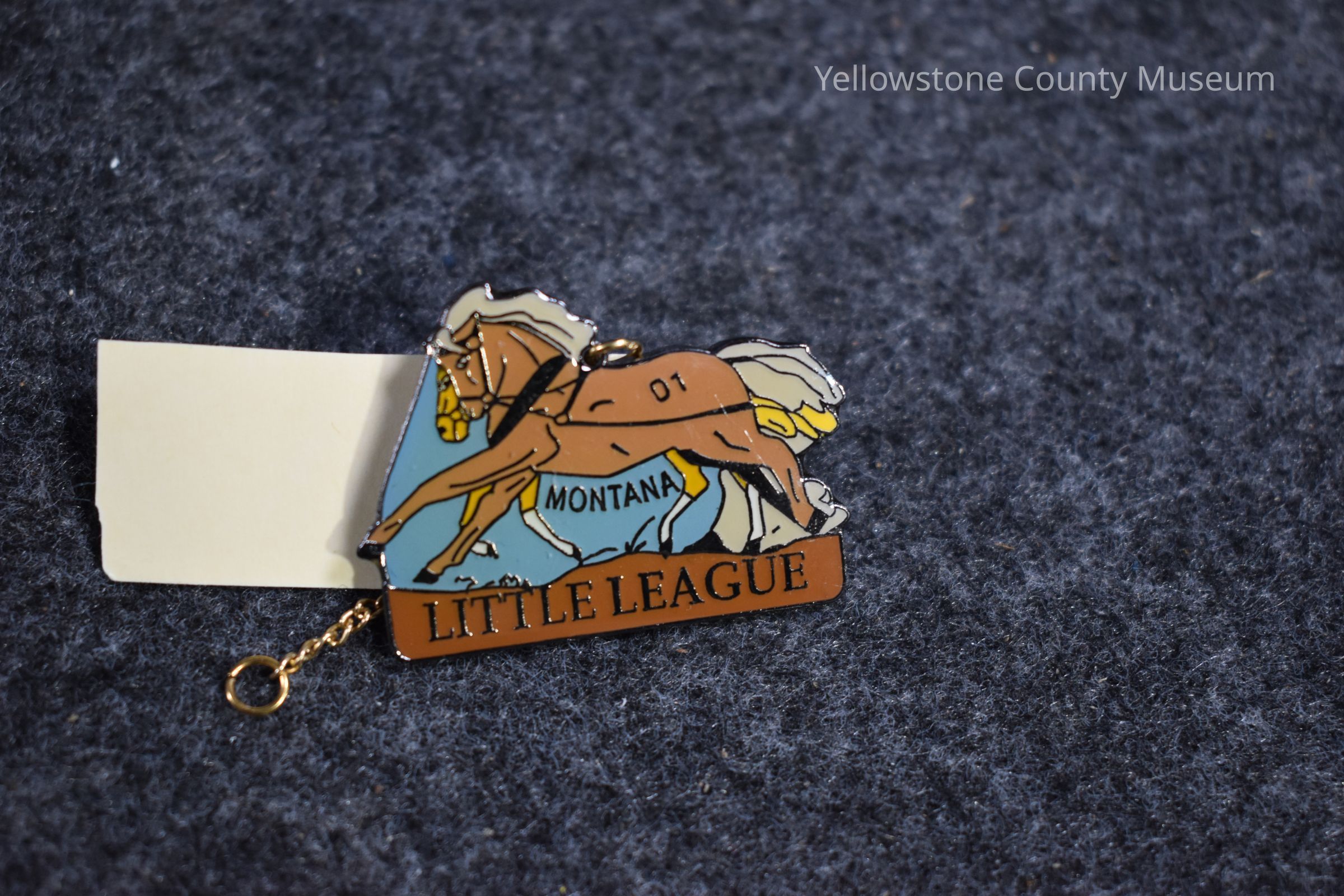 A pin shaped like a brown horse. Has a gold chain that connects it to the accompanying pins. has text that says "Montana Little League." 3 of a 3 piece set of pins.Acquisition