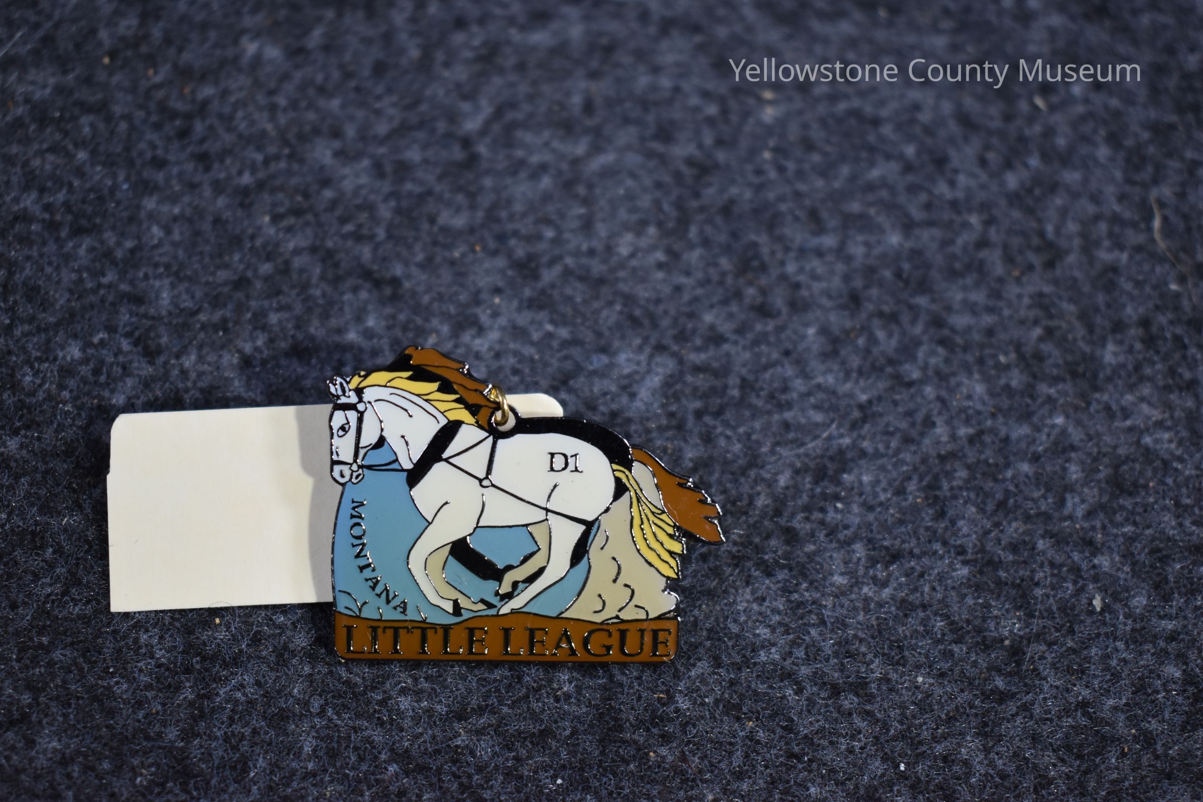 A pin shaped like a white horse, has a gold chain that can be connected to accompanying wagon pin. has text that says "Montana Little League." 2 in a set of 3 pins.Acquisition
