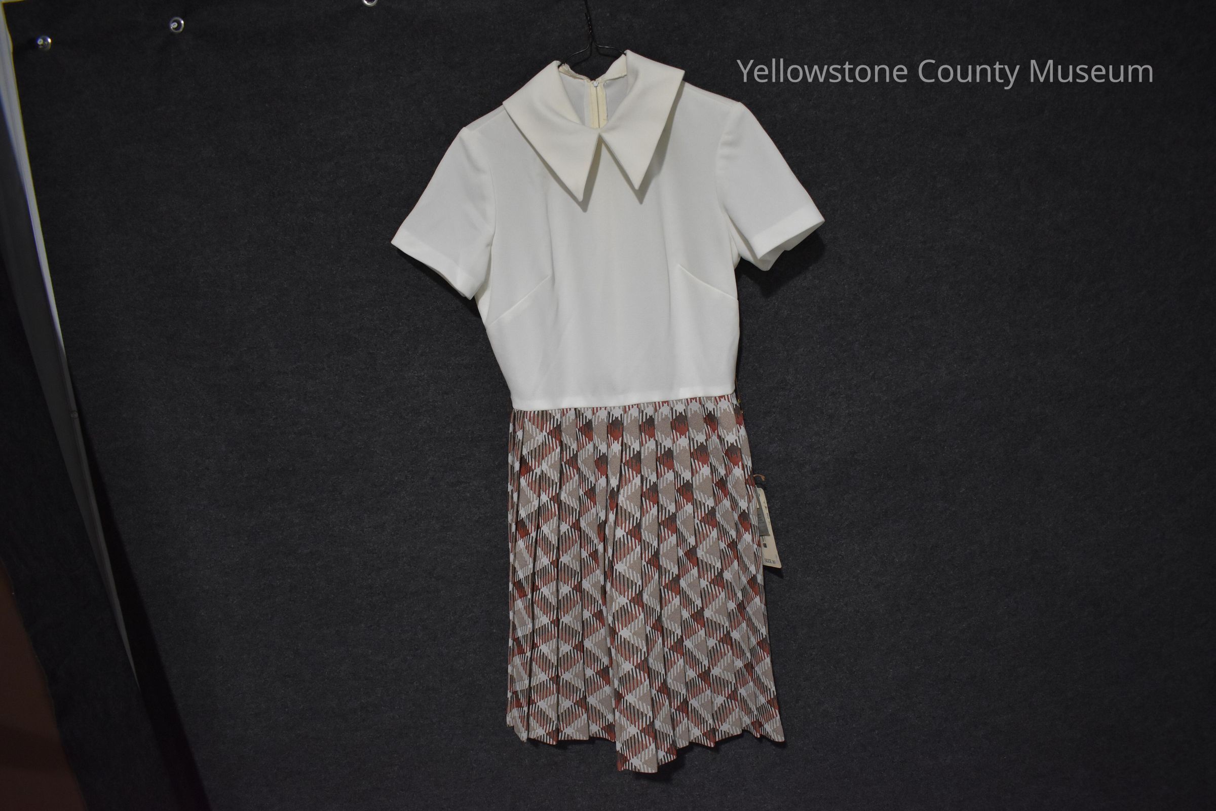 Dress, polyester (?), white attached top is short-sleeved and has a pointed collar, skirt is pleated and multi-colored with diamond shaped design of brown, tan, orange and white.Acquisition