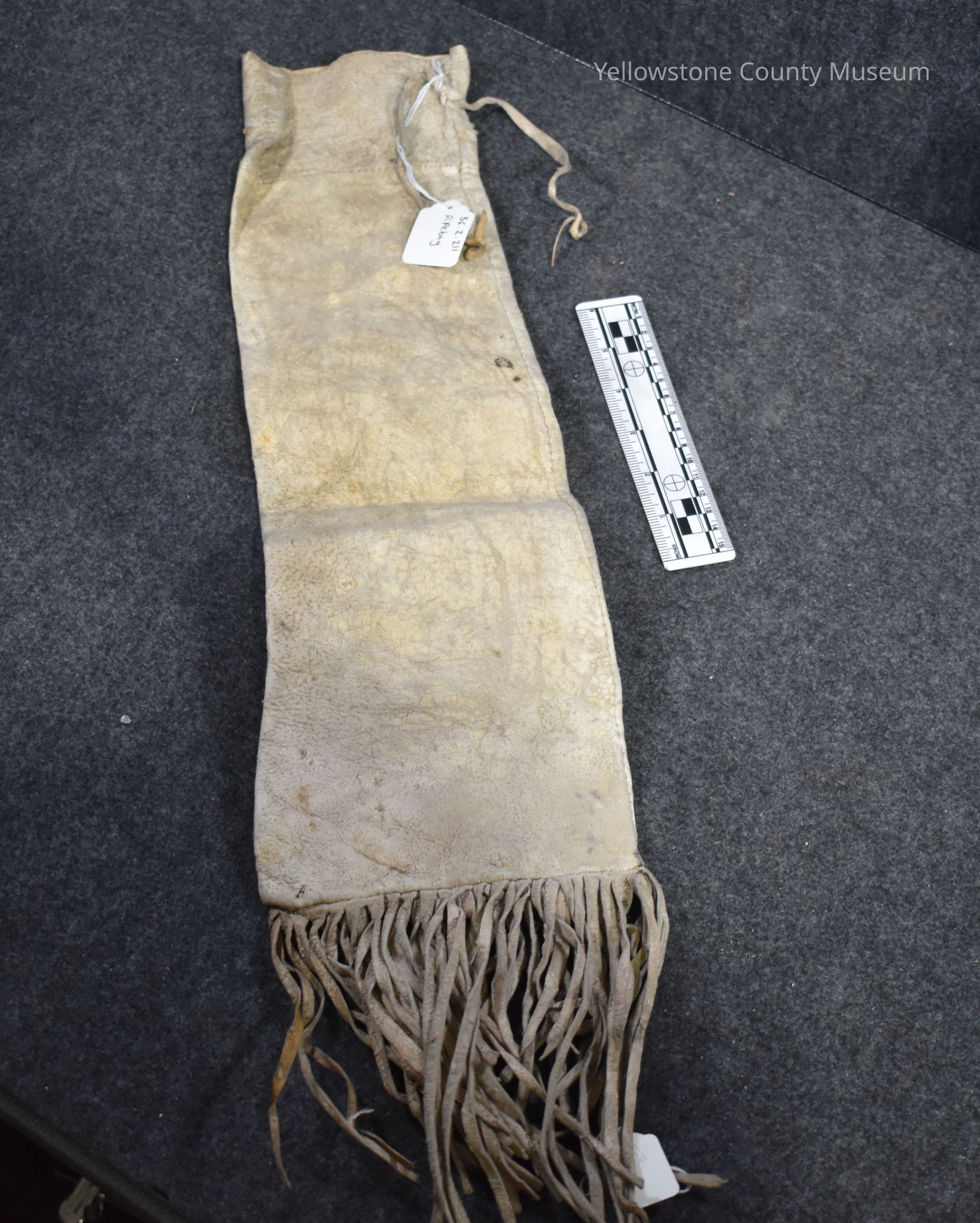 (2-211*) Indian rawhide pouch Buckskin with no adornment but fringe. Original Museum Collection