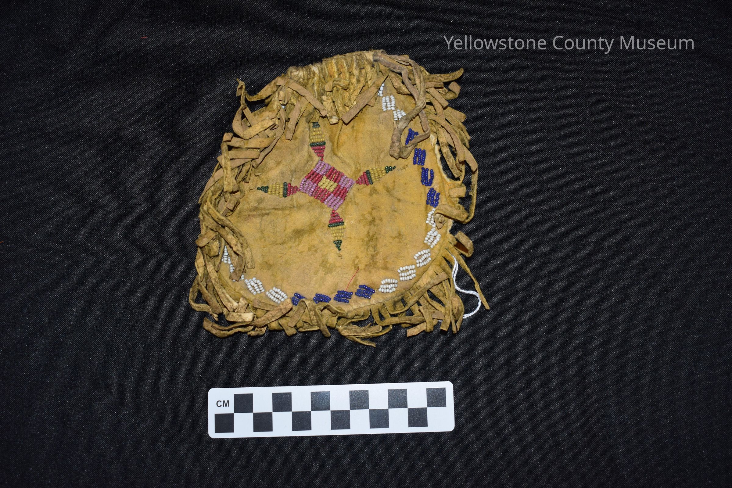 Purse beaded with blue, white, red, pink, lavender beads & fringed.Acquisition