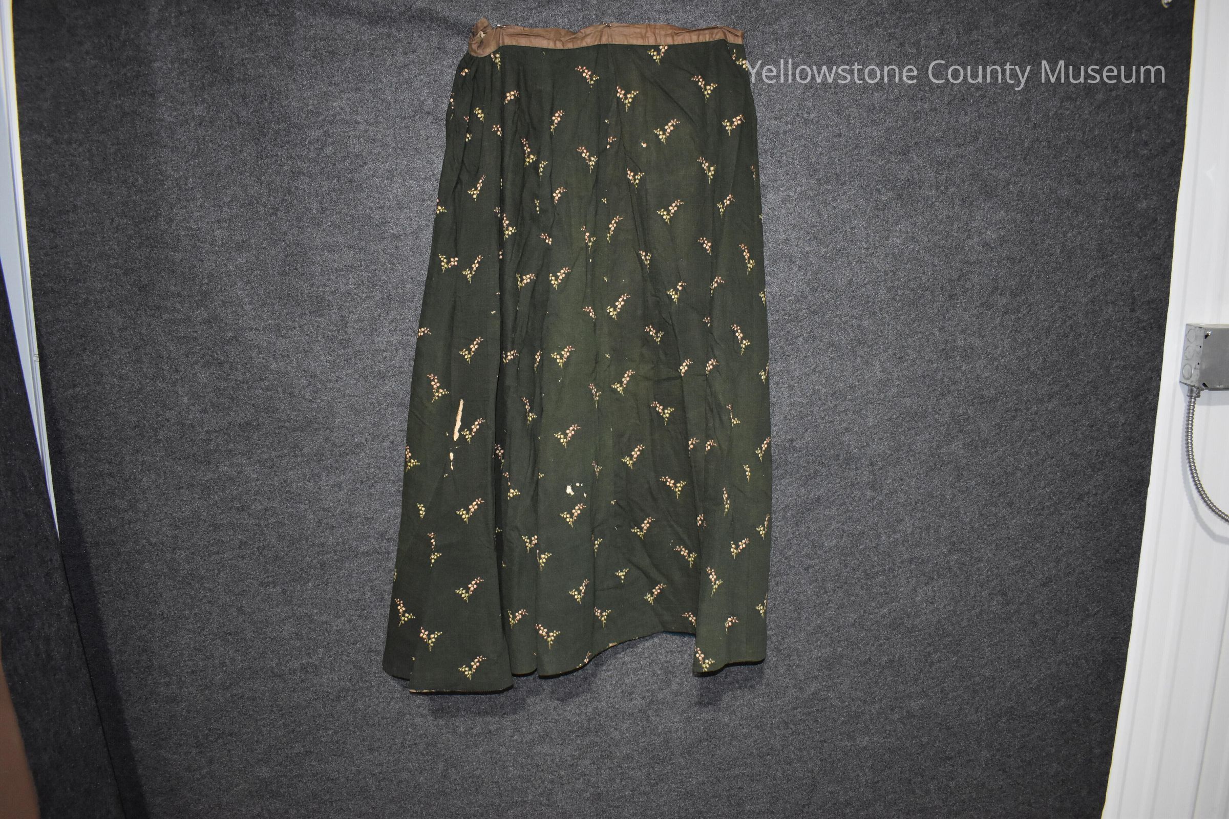Riding Skirt; green, full length, full skirt with small floral pattern in tan.