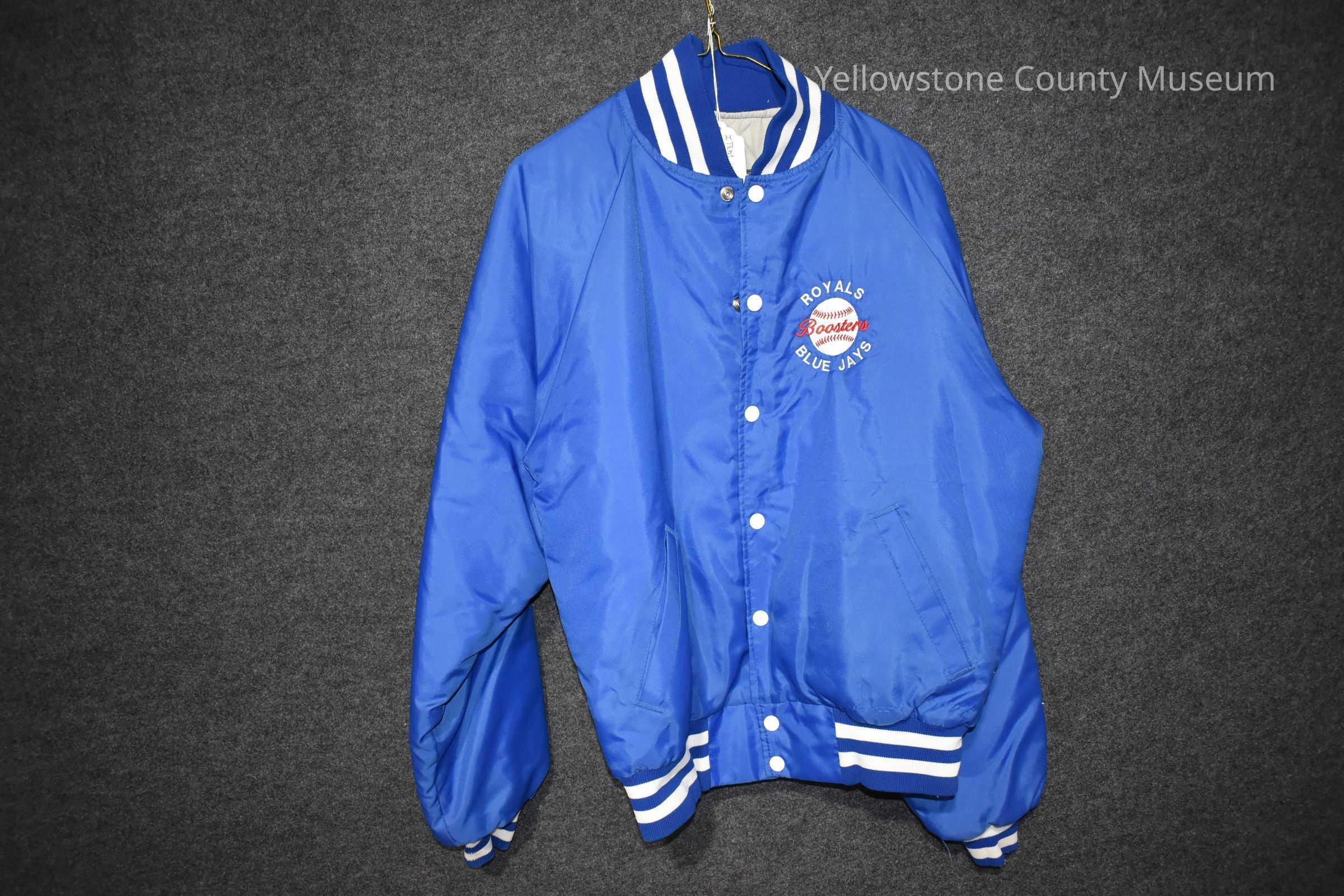 A blue windbreaker with white buttons. There is a logo on the left breast pocket that says: "Royals, Blue Jays, Boosters" with a baseball with red laces. Tag on the inside of the jacket has writing in permanent marker that reads "MB" that stands for Marcie Bayne. ITEM 116Acquisition