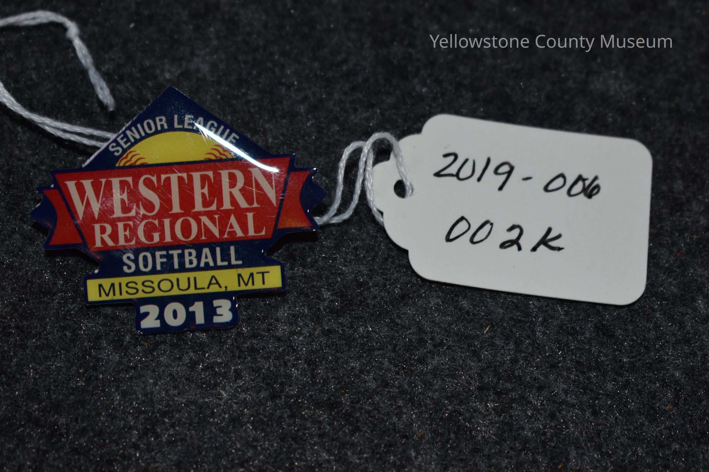 A pin with a blue background with a sunset and a large red banner that reads "Western Regional." Above the sunset reads "Senior League," and under the banner reads "Softball," and a yellow banner reads "Missoula, MT." The year is 2013.Acquisition