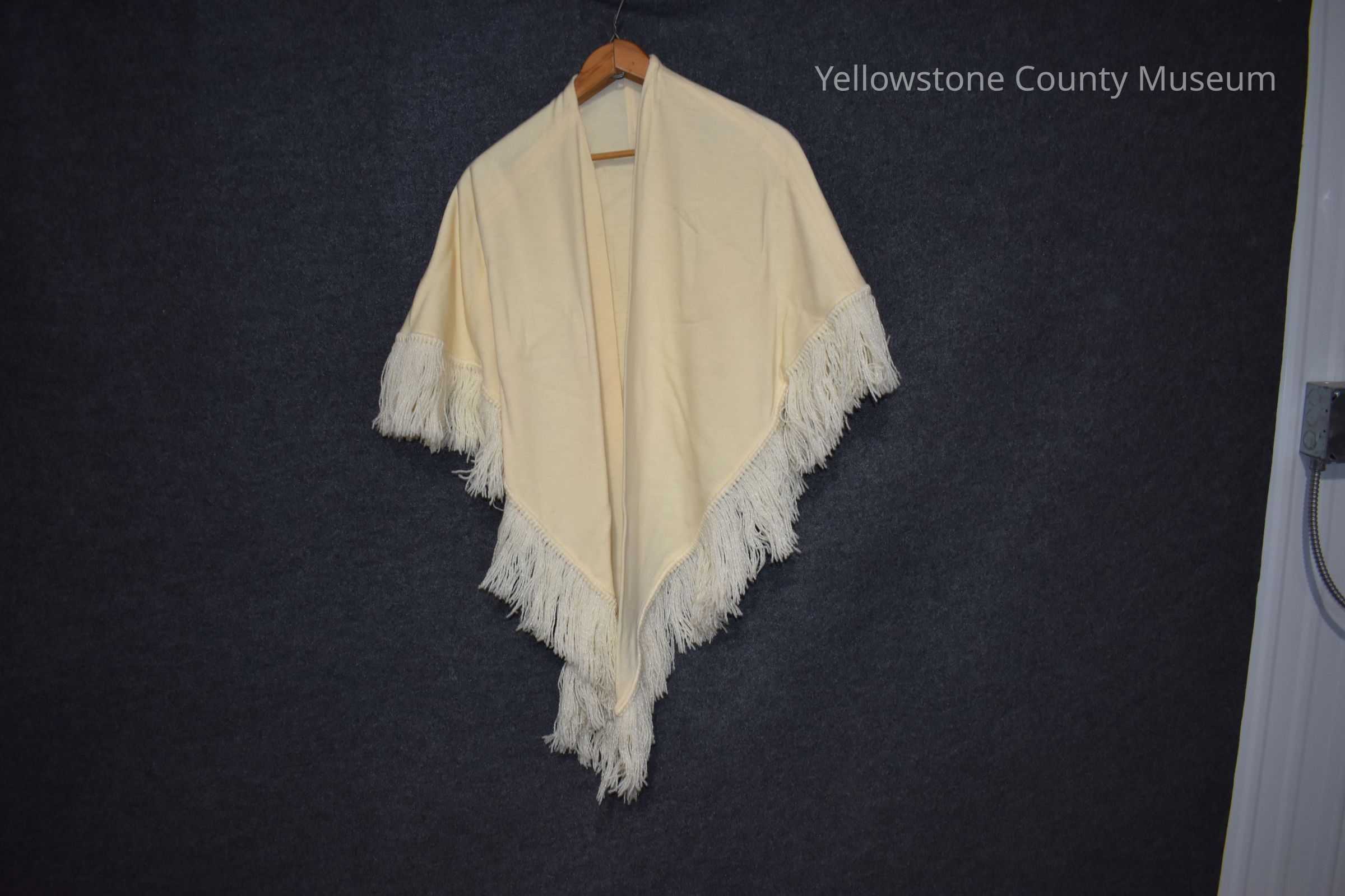 Triangular, white wool shawl with fringe.