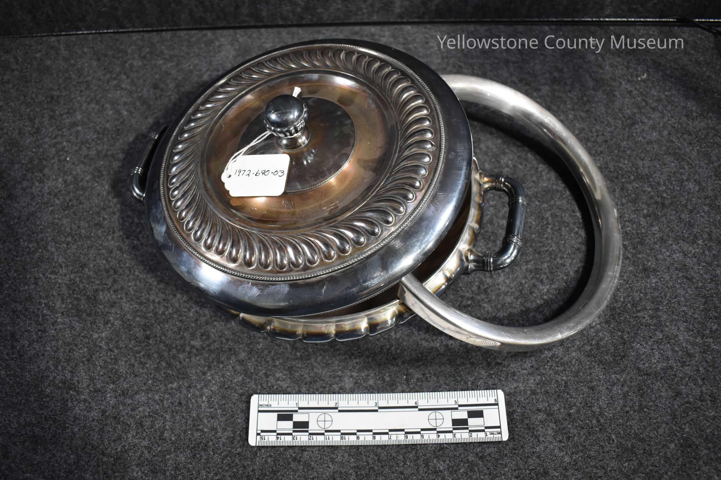 Display card reads: Silver-plated Tea Pot with Burner & Casserole; Formerly owned by the late Mr. & Mrs. Haskell, who came to Billings in 1912. Donated by Miss Gertrude Haskell of Billings."Acquisition