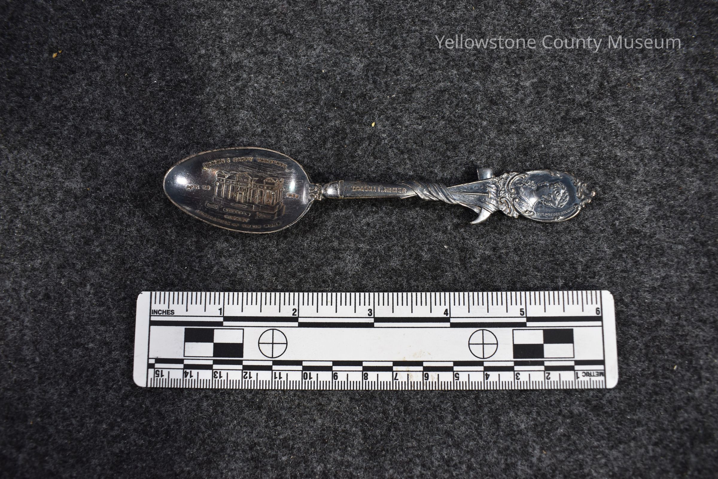 Bowl of spoon reads "Women's happy thoughts, Apr 29, 1893, Colorado Palace, Mineral Casket, indicative of their work", handle reads "Nebraska Hammer", end of spoon is embossed with a picture identified as "Mrs Potter Palmer", and back reads "Montana Oro Y Plata".