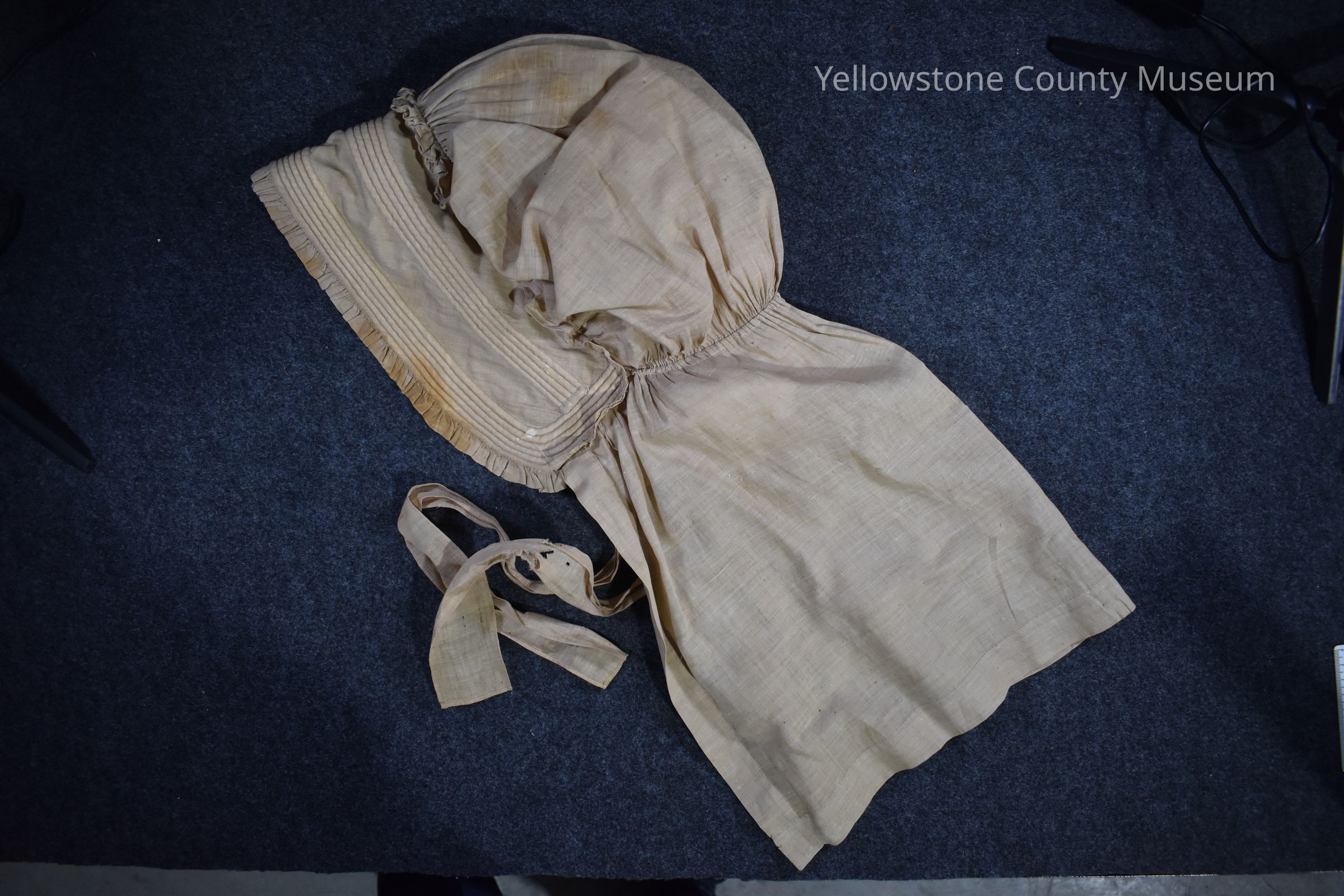 Sunbonnet; tan colored, with ruffled visor and long neck cover. Stained and torn in spots.Acquisition