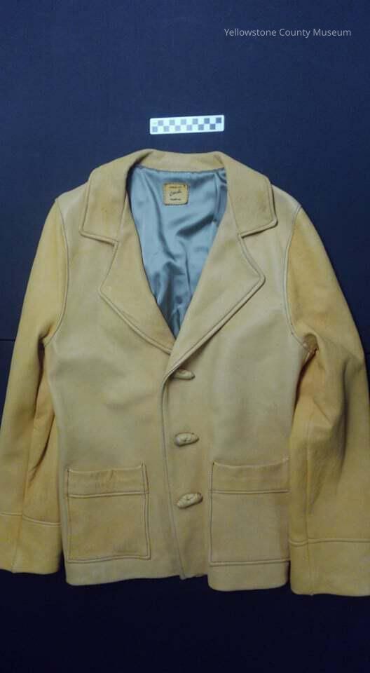 A mens-sized tan leather jacket. Jacket is of plain design, as three rolled leather buttons that clasp in the front, jacket interior is grey satin, has two square pockets on front. Feature a leather patch/maker's mark below the collar and sewn to the satin which reads "Styled by Caroll, Billings."Acquisition