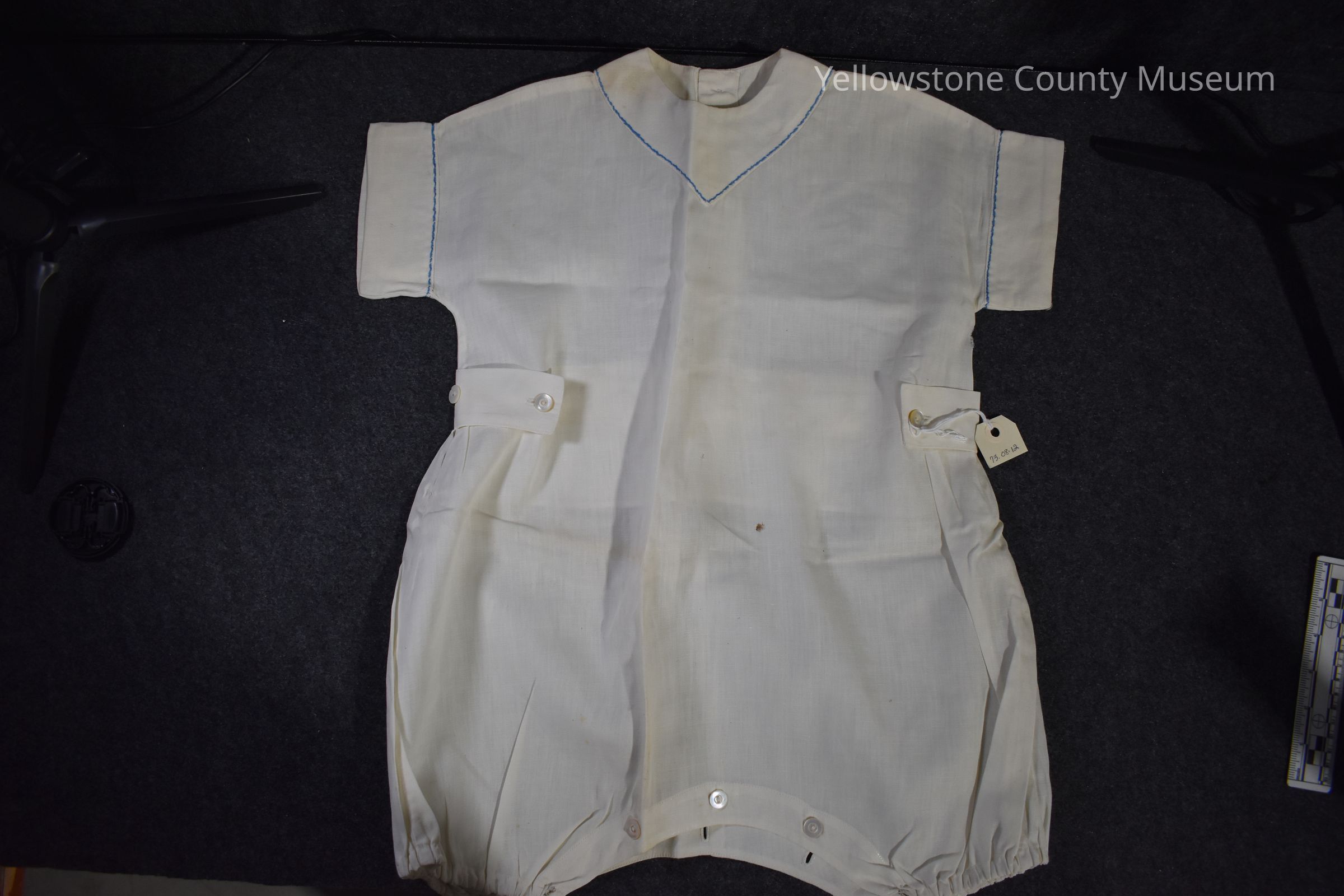 Toddler Boy's white linen Romper, blue trim around neckline and short sleeves, buttons at bottom and waist, legs gathered.Acquisition