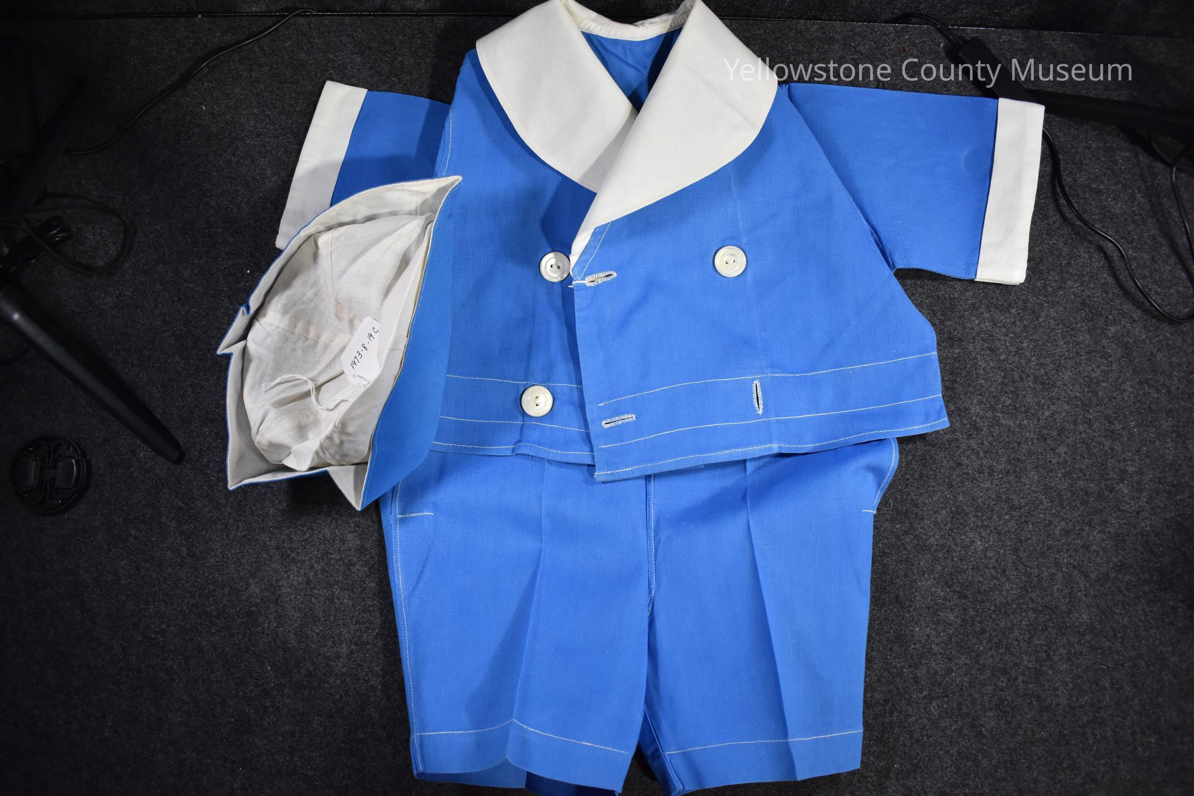 Tot's 2-piece Short Suit; Starched blue linen with white trim and buttons; matching sailor cap.Acquisition