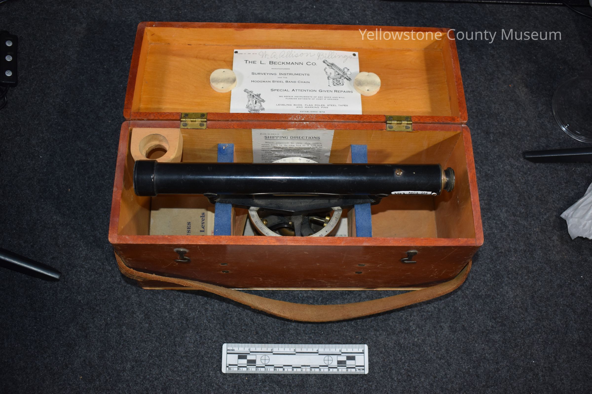 A surveying set, transit is in a wooden box; the transit consists of a black viewing scope with a level beneath it; under the level is the transit base that is intended to be mounted on a tripod; the transit is housed in a wooden box with a special mount and a leather strap. Set includes tripod and target rod. Includes a Beckmann catalogue.Acquisition