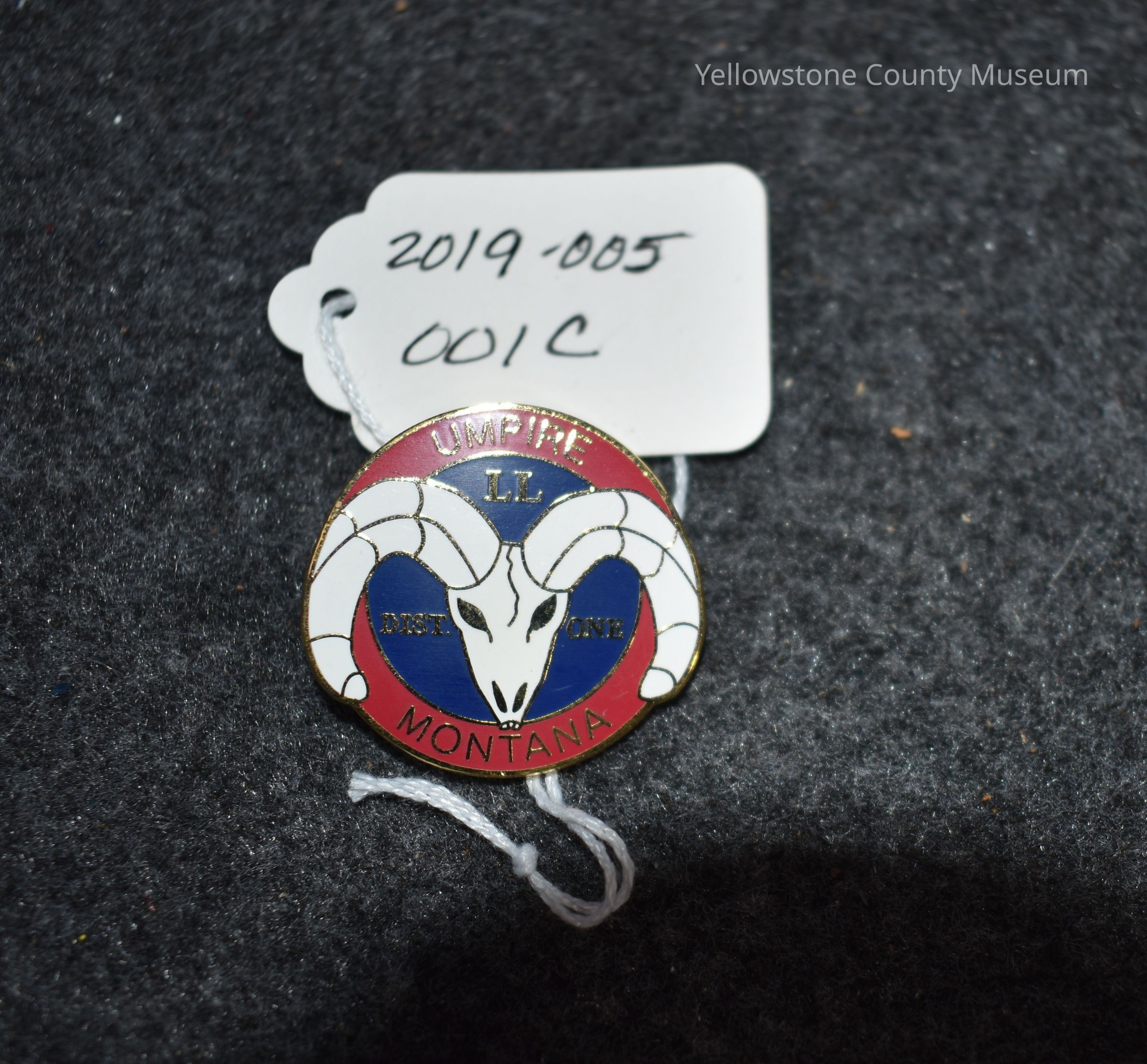 A round umpire pin that is blue with a red border and a white ram's skull in the middle. In gold lettering, it reads "Umpire - LL - Dist. One Montana"Acquisition