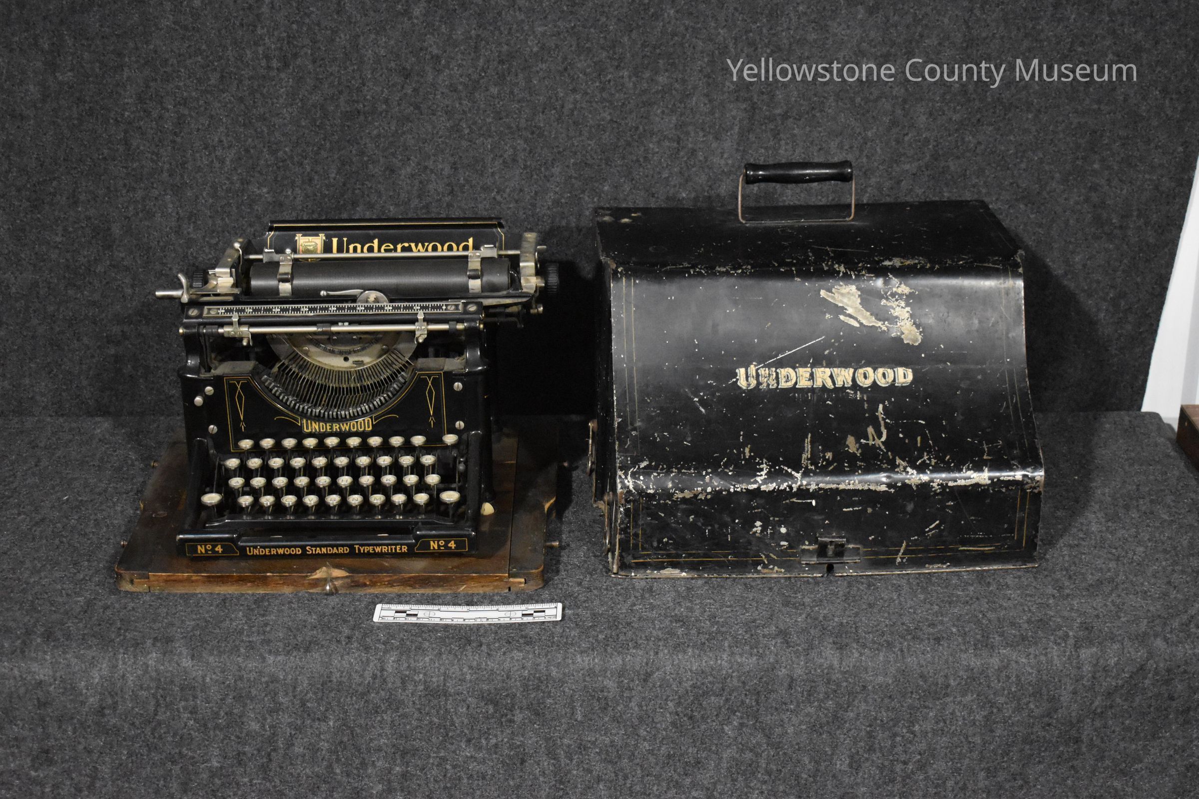 Typewriter has a metal case with the gold and white letters " Underwood" and an oak base.