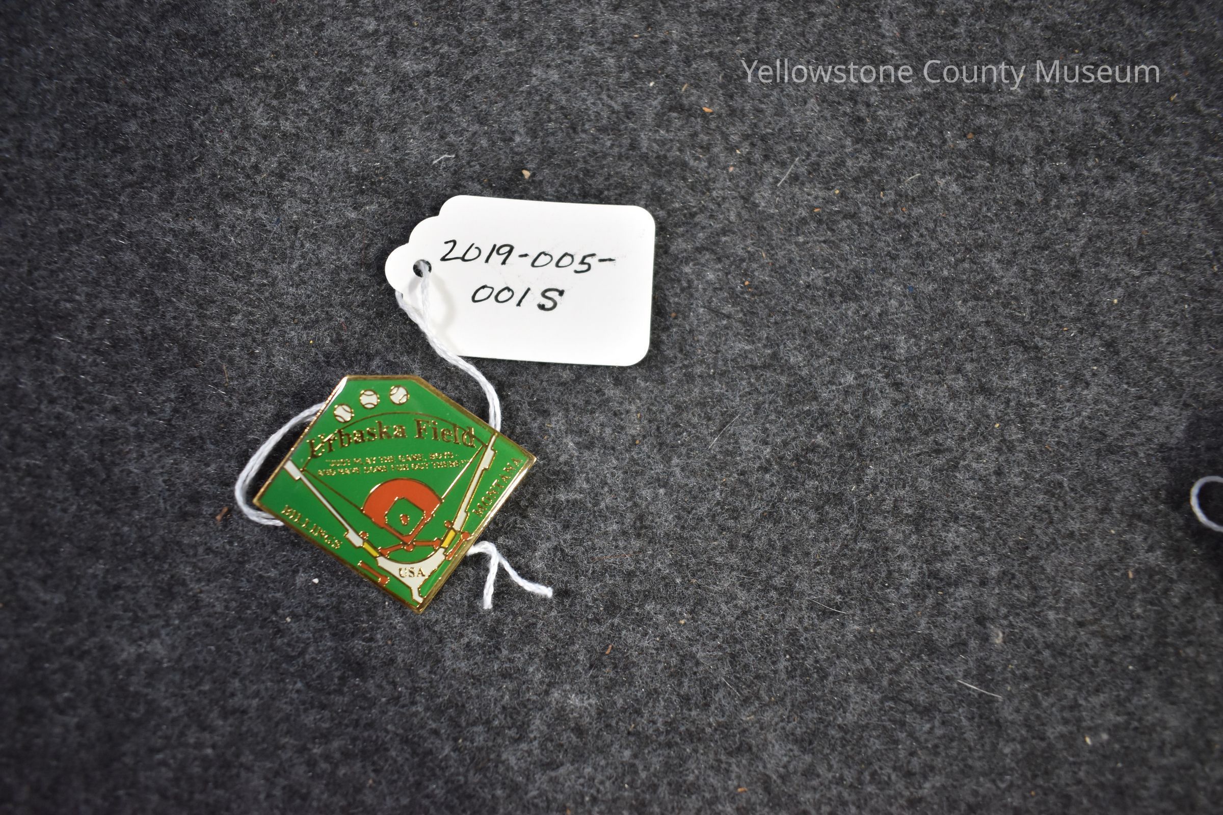 A green pin that is shaped like a baseball diamond. There are three baseballs across the top and in gold lettering reads: "Urbaska Field 'Just play the game, boys, and have some fun out there!' Billings Montana USA"Acquisition