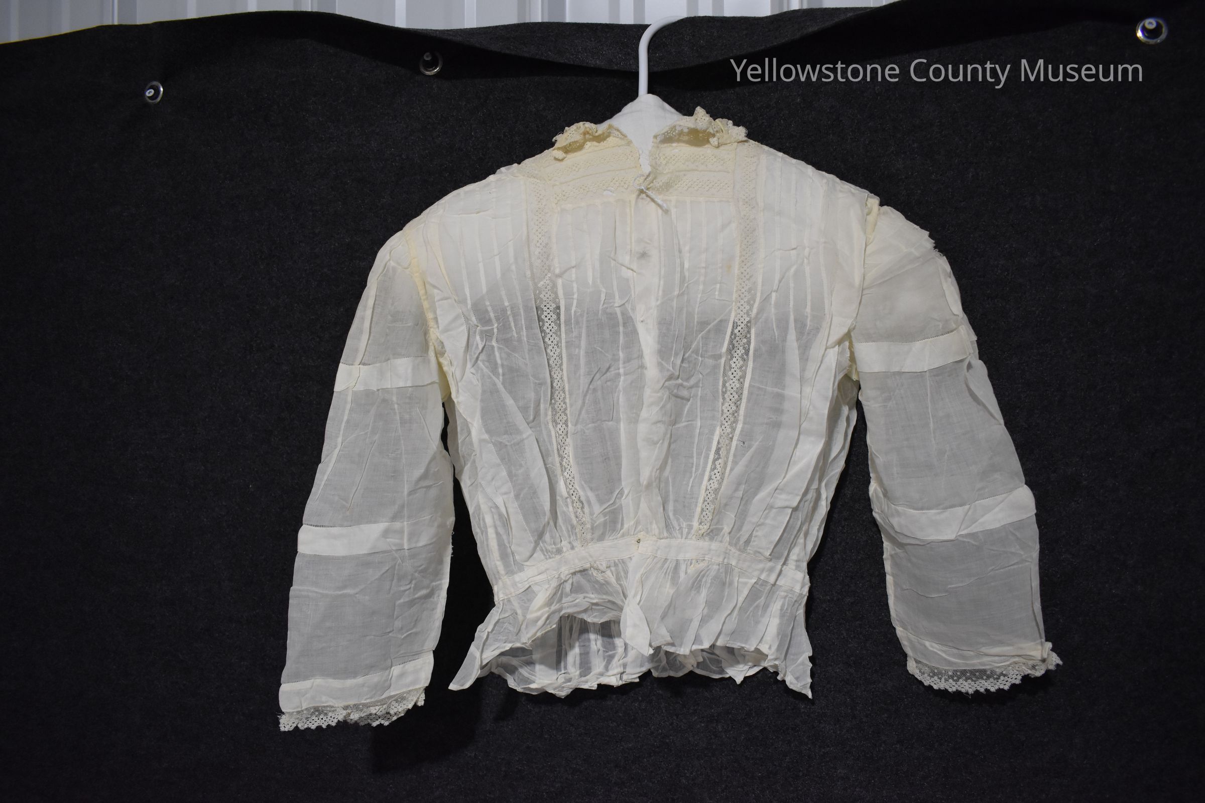White linen shirt waist top & matching skirt trimmed with tape lace, ruffles; age yellowed and stained. Sleeve torn at shoulder.