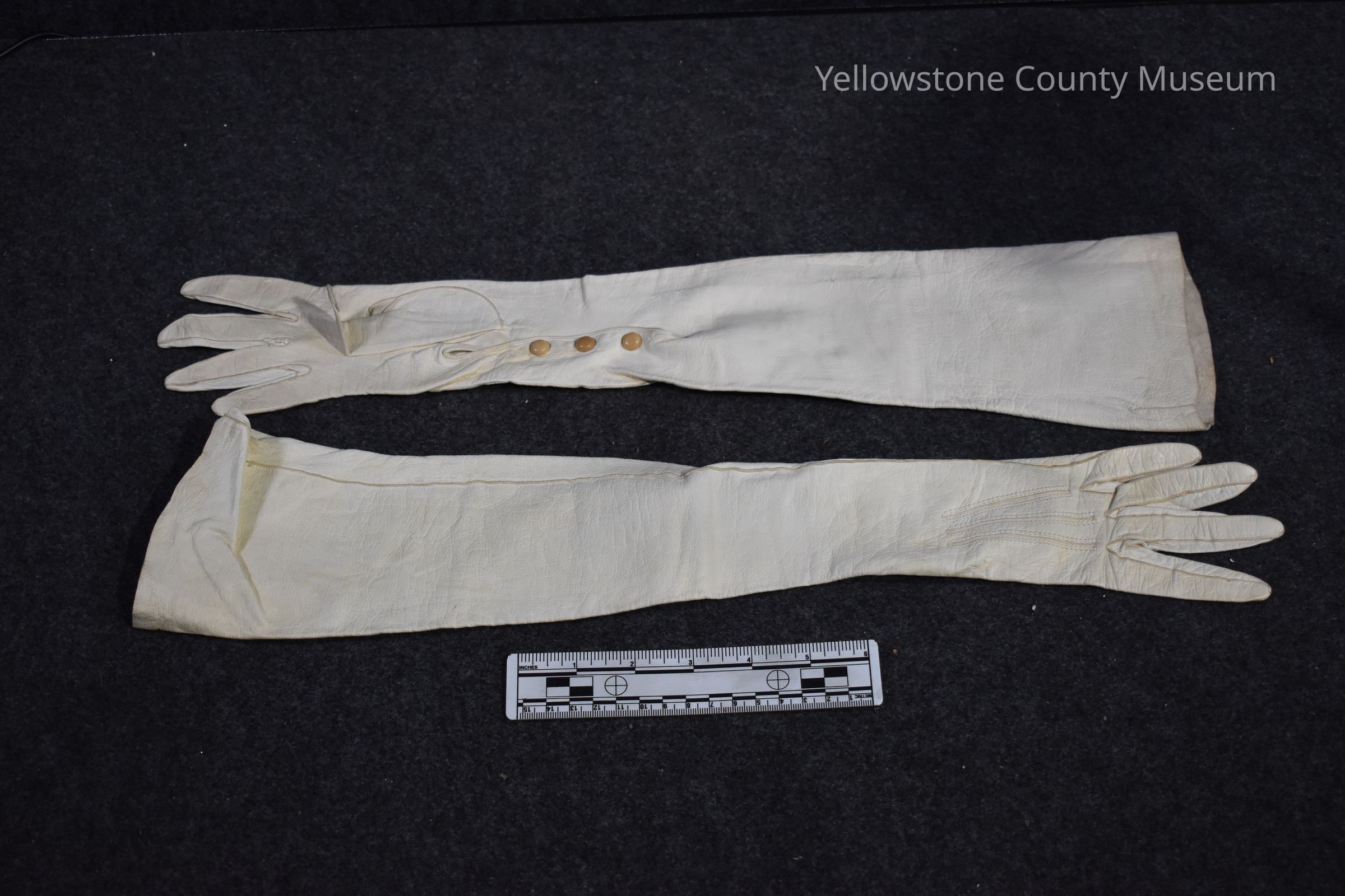 A pair of long, white leather gloves; the gloves are almost elbow length and have 3 plastic snap button on the underside of the wrists; the buttons were likely once white, but now have turned a brown/tan color;Acquisition