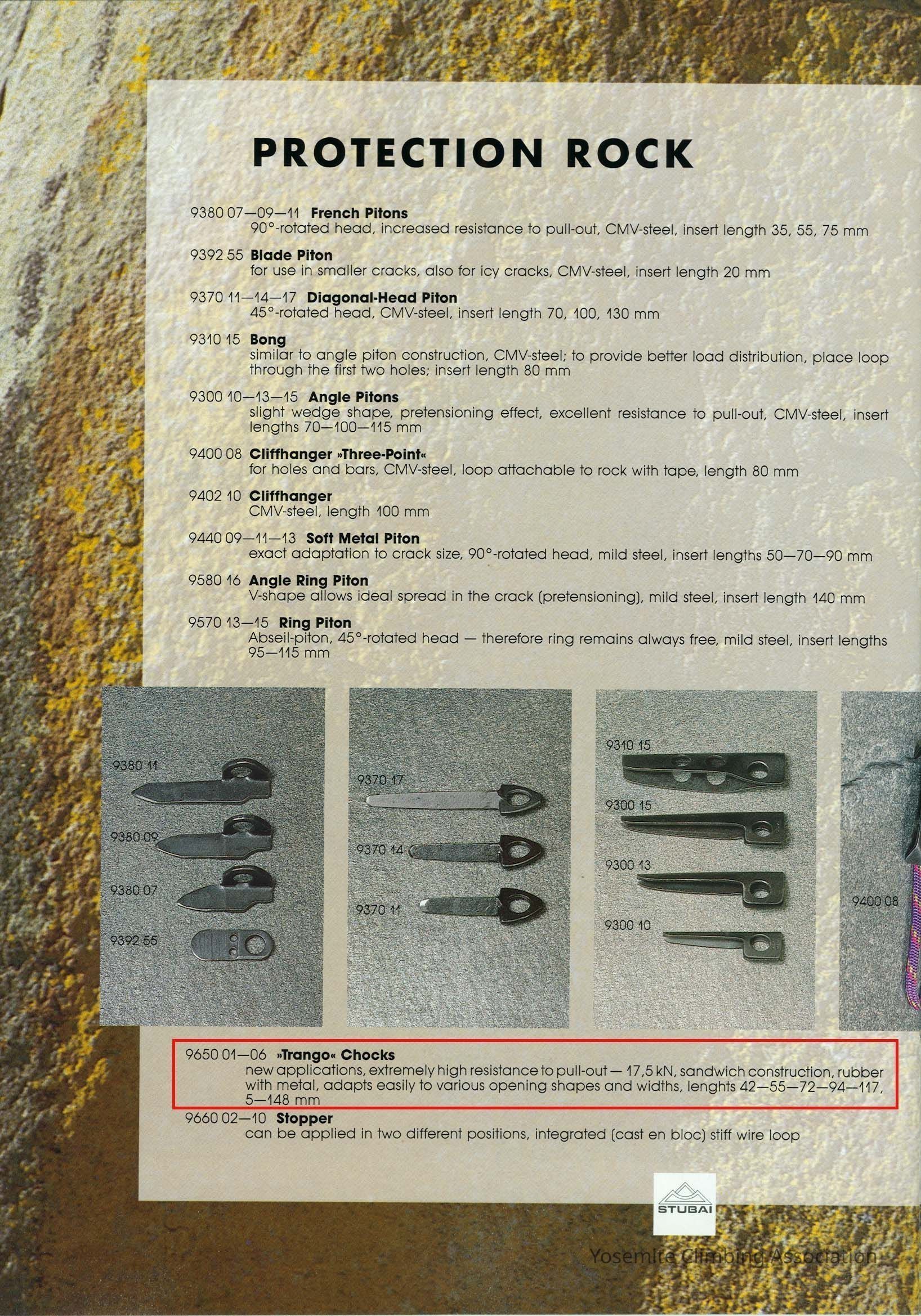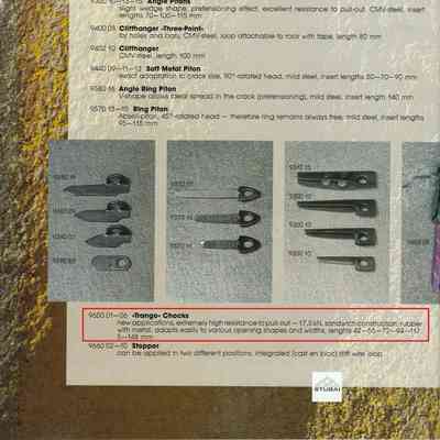 The description in the catalog is :"Trango, Chocks- new applications, extremely high resistance to pull out – 17.5 kN, sandwich construction, rubber with metal, adapts easily to various opening shapes and widths, lenghts 42-55-72-94-117, 5-148 mm"Collection