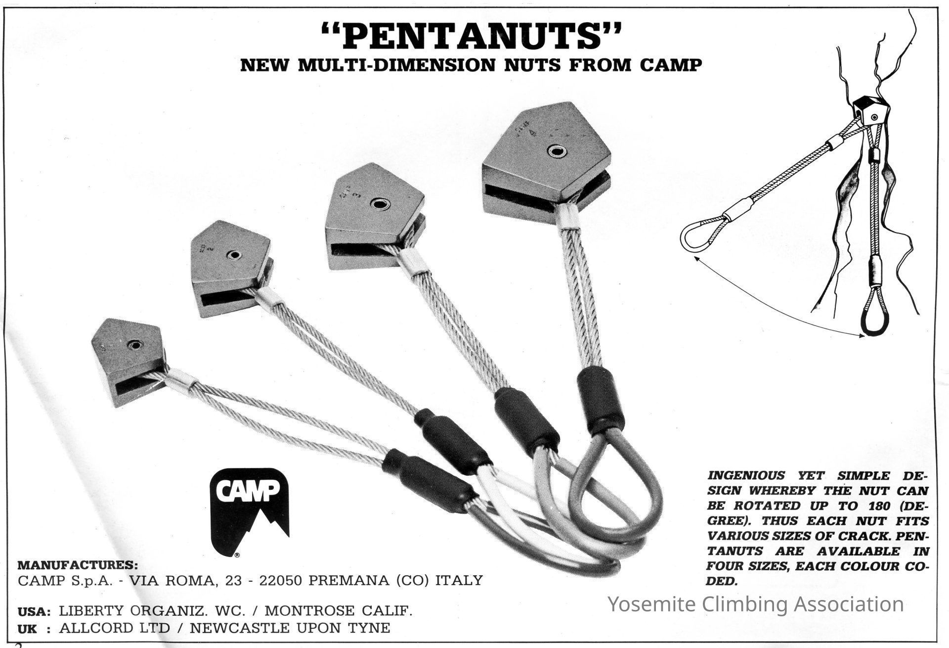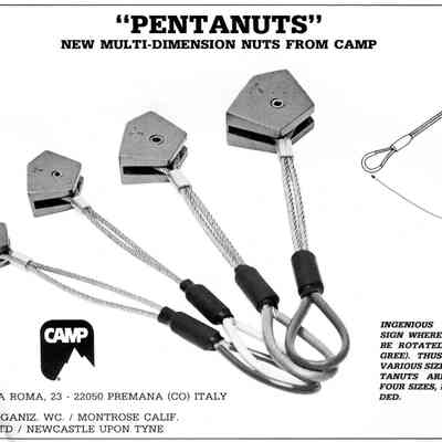 "Early forms of rock protection took the hexagonal shape and name ‘nuts’ from the engineers nuts that had been used previously to jam into rock fissures for running belays and anchors. A multitude of variations on the theme followed, these five-sided ‘Pentanuts’ was one. Created by the Italian company CAMP in 1985 they had a limited success on the continent, with very few making it over the channel to the UK, the more versatile ‘Friends’ & other camming devices being more popular..." -Excerpt from Scottish Mountain Heritage Collection (SMHC).Collection