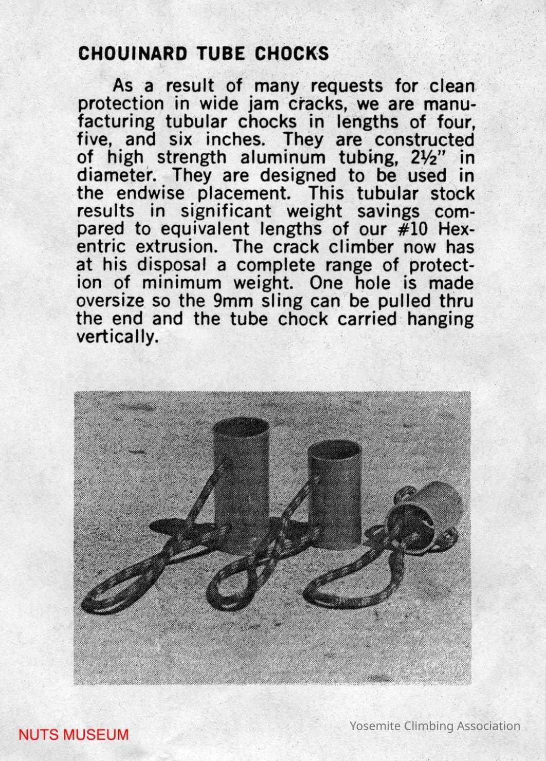 This is a tube chock manufactured in the 1970s by Chouinard Equipment. This is a number 4, which indicates it was designed for a 4 inch crack. It was donated by Tom Frost and has a longer sling attached, to wear over your head and shoulder which was more common in the 1960s. See attached the advertisement in the The Great Pacific Iron Works 1973 extra leaflet.Collection