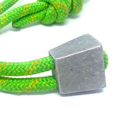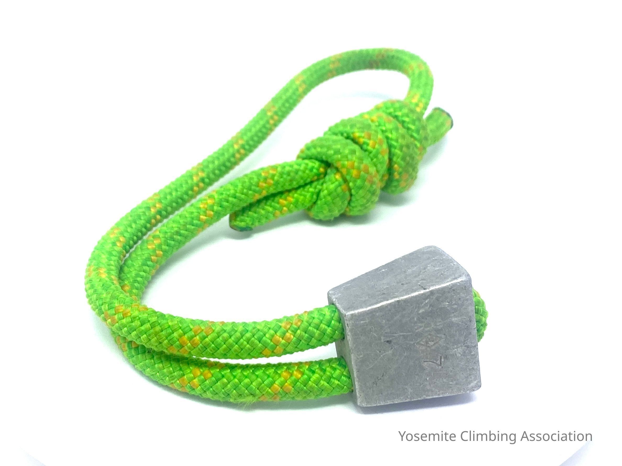 An early edition of a Chouinard Equipment Stopper manufactured by Tom Frost and Yvon Chouinard. The early stoppers had nylon cord slung through, however it was difficult to thread the thick rope through the nut. The reason was that thicker the cord, the stronger the device was. Now stoppers are all manufactured with a swaged wire design that is stronger and easier.Collection