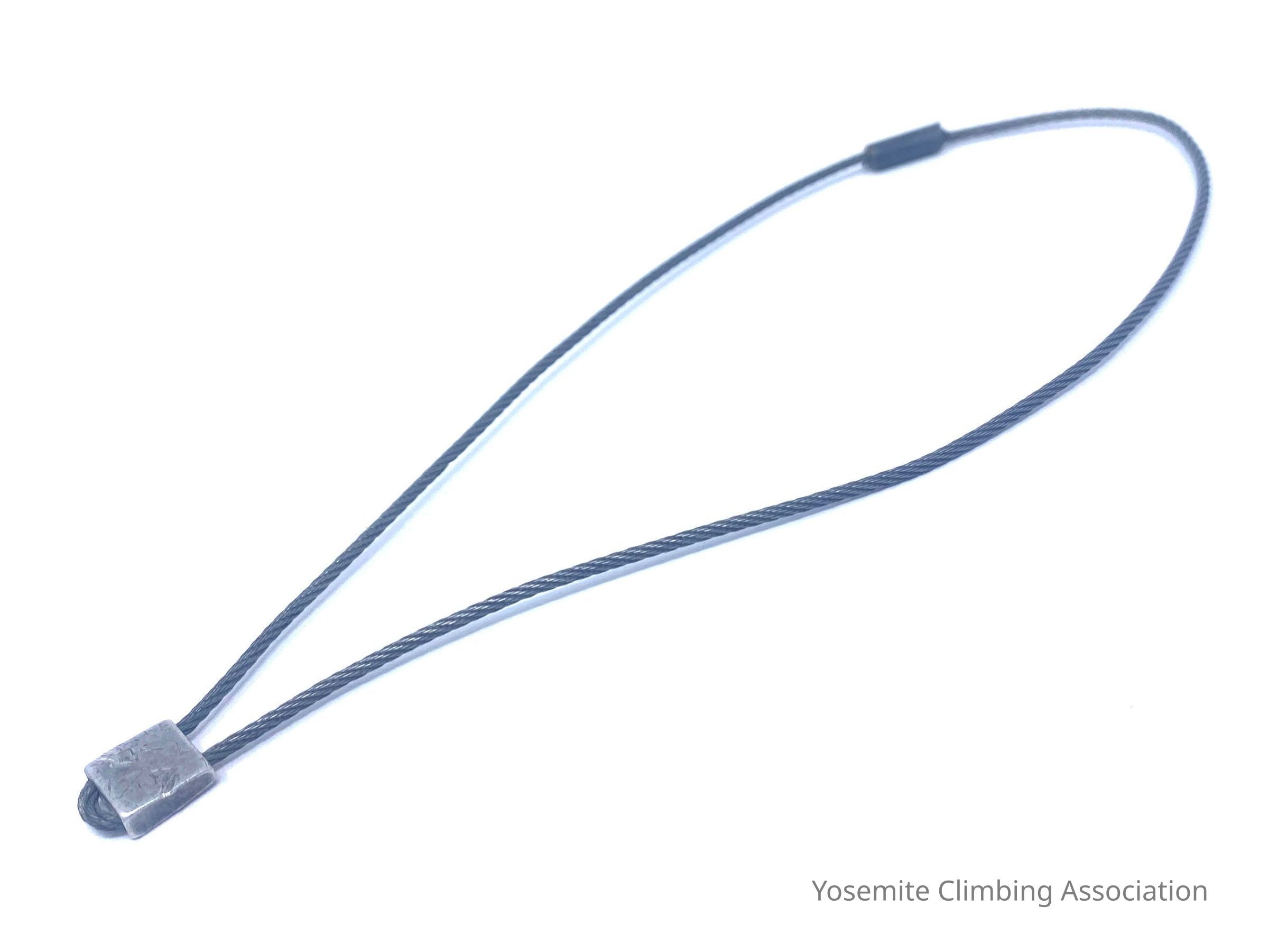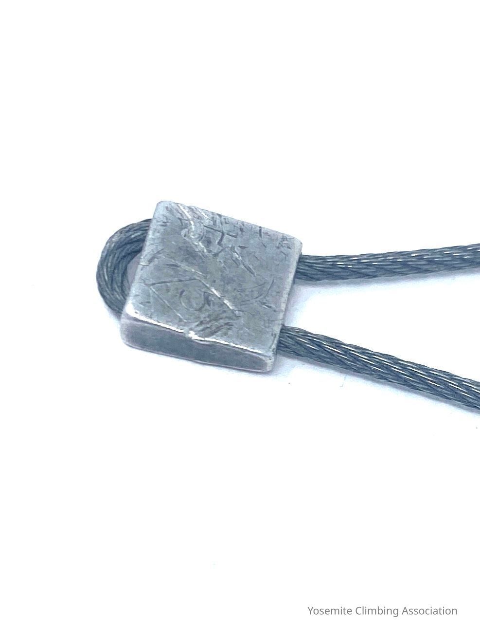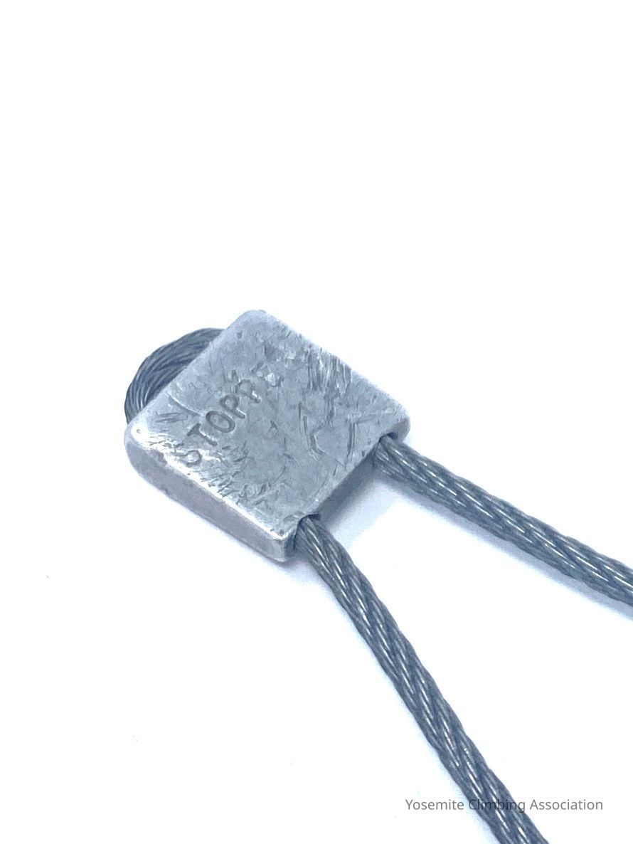 One of the stoppers that was used on the 1973 ascent of the Northwest Face of Half Dome. Climbers Doug Robinson, Dennis Hennek, and Galen Rowell climbed without the use of pitons, making it the first big wall clean ascent. The climbers did not even bring a hammer. It was featured on the cover of National Geographic's June 1974 issue. This was a big achievement at the time because there was not much clean climbing gear in production. This stopper was manufactured by Chouinard Equipment and is an early edition. The later modifications added a sleeve to the wire to protect fingers from damaged threads. They also added later a sliding sleeve to prevent multiple stoppers on racks from getting tangled.Collection