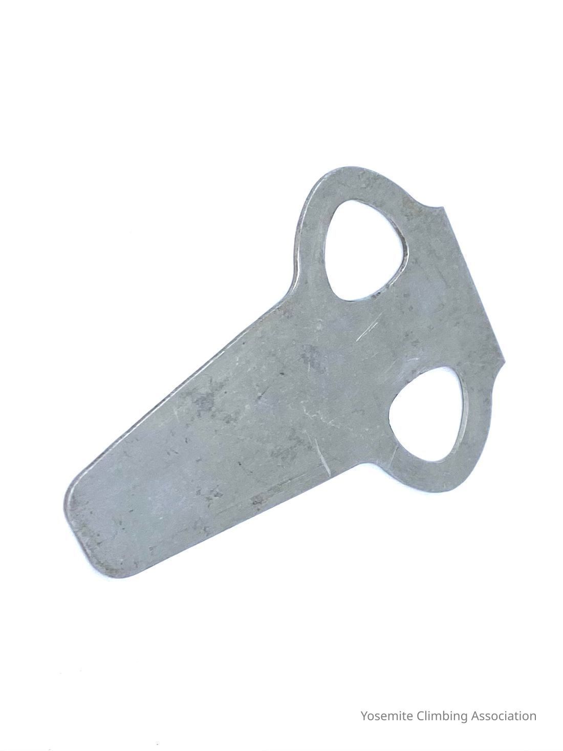 This is a die cut angle piton blank, made out of thin gauge aluminum. Most likely used as a prototype for design purposes at Chouinard Equipment, the company Tom Frost and Yvon Chouinard made to manufacture and sell pitons.Collection