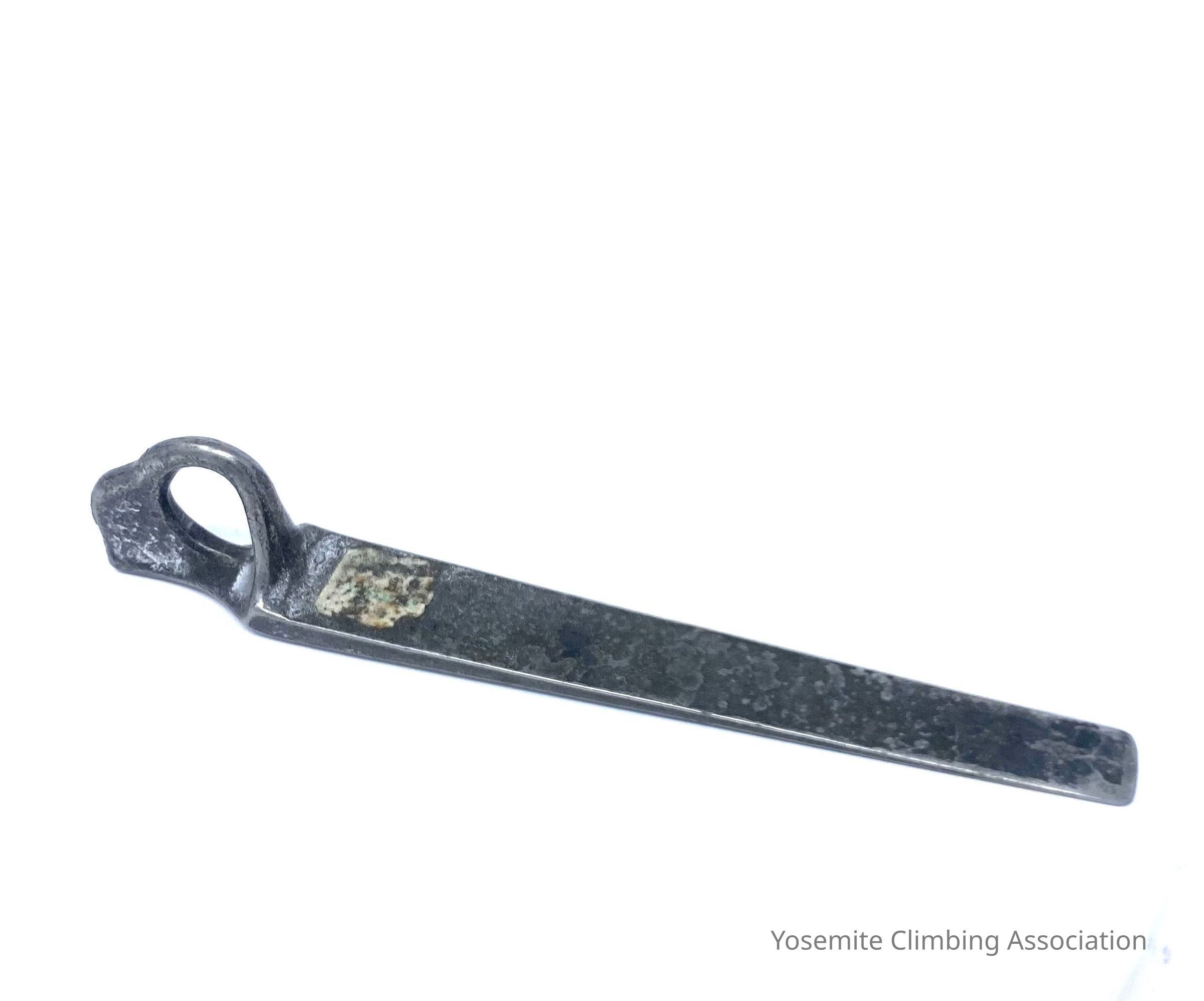This piton is brand new and was not used while climbing. Dolt was the best equipment maker at the time, and even had patents for his designs. The eye of his pitons is patented and allows for two carabiners to fit through. Interestingly, manufacturers at the time would usually only inscribe an initial, but Dolt inscribed his name and sometimes USA on the opposite side. Dolt was stationed at Castle Air Force Base in Merced and was a machinist for Mcdonnell-Douglas, creating his pitons on nights and weekends. By the 1970s this style was used as a nut tool, since most people did not like the long piton style.Collection