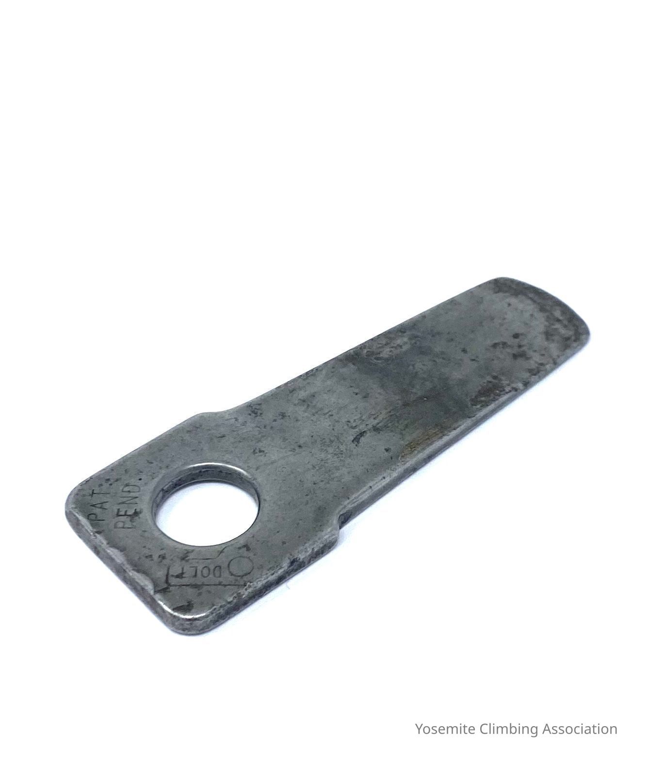 This piton is brand new and was not used while climbing. Dolt was the best equipment maker at the time, and even had patents for his designs. The eye of his pitons is patented and allows for two carabiners to fit through. Interestingly, manufacturers at the time would usually only inscribe an initial, but Dolt inscribed his name and sometimes USA on the opposite side. Dolt was stationed at Castle Air Force Base in Merced and was a machinist for Mcdonnell-Douglas, creating his pitons on nights and weekends.Collection