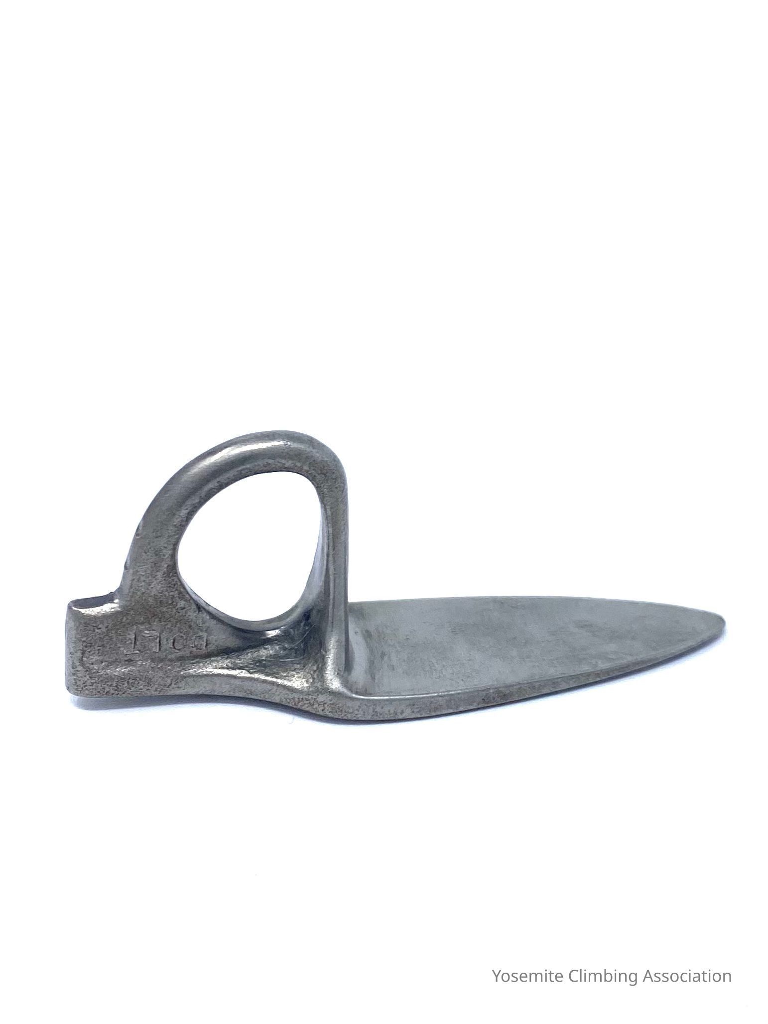 This piton is brand new and was not used while climbing. Dolt was the best equipment maker at the time, and even had patents for his designs. The eye of his pitons is patented and allows for two carabiners to fit through. Interestingly, manufacturers at the time would usually only inscribe an initial, but Dolt inscribed his name and sometimes USA on the opposite side. Dolt was stationed at Castle Air Force Base in Merced and was a machinist for Mcdonnell-Douglas, creating his pitons on nights and weekends.Collection