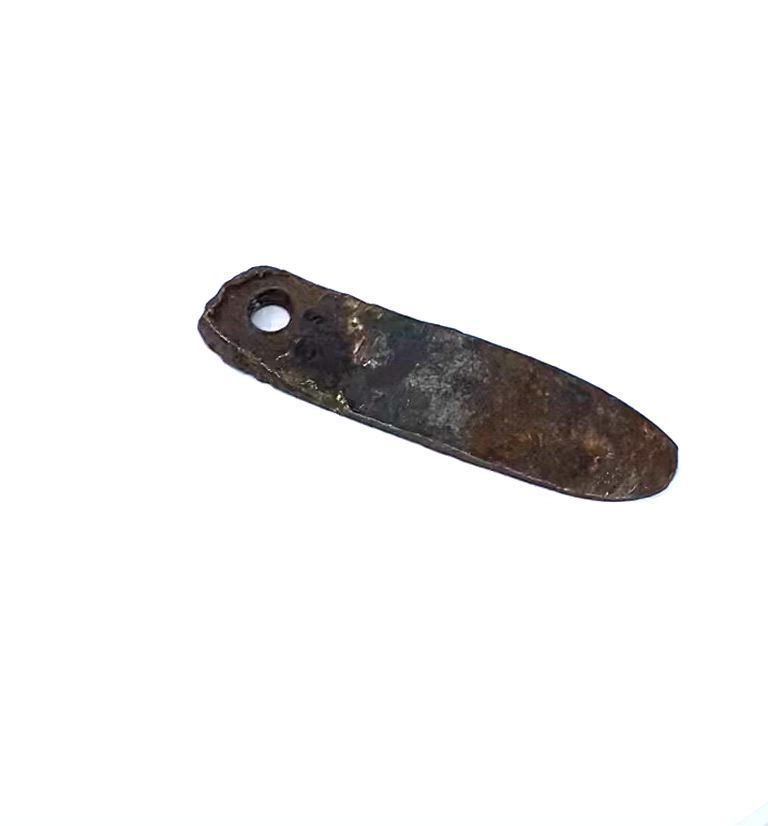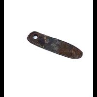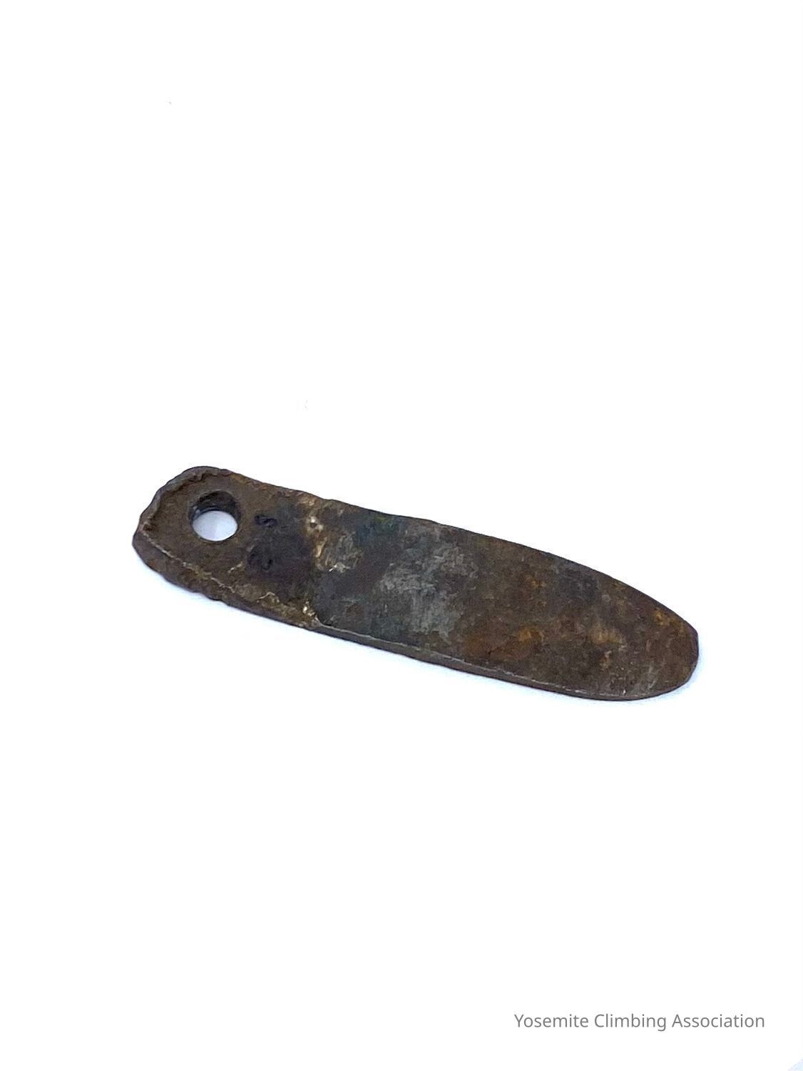 Piton owned by Ellen Searby, partner of William Harding during his ascent of the Nose. Searby was in the base support group when Harding climbed the Nose. She took photos of them hauling the Dolt cart up, and brought loads of supplies to the base. A small ring was most likely placed in the hole, as rope was not commonly used at that time and the hole is too small for a carabiner. Creator unknown.Collection