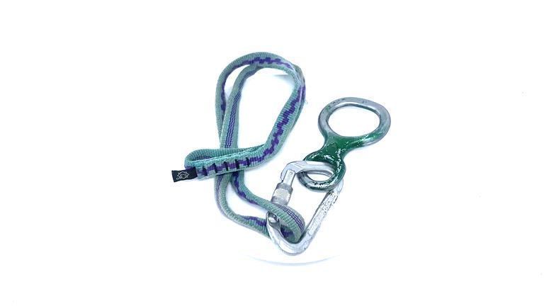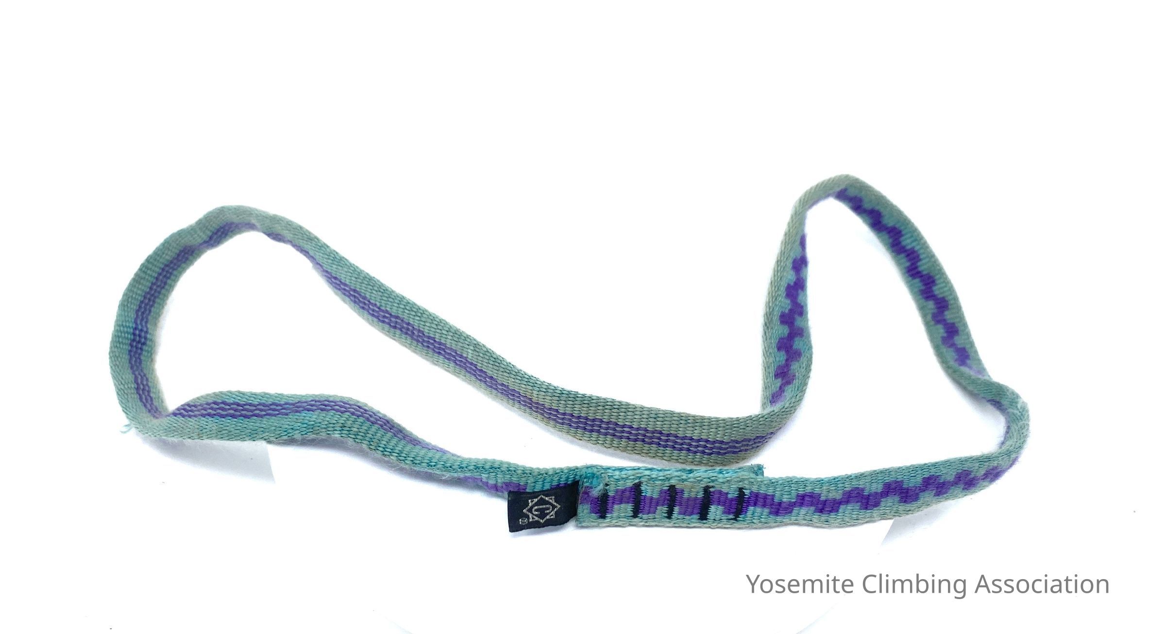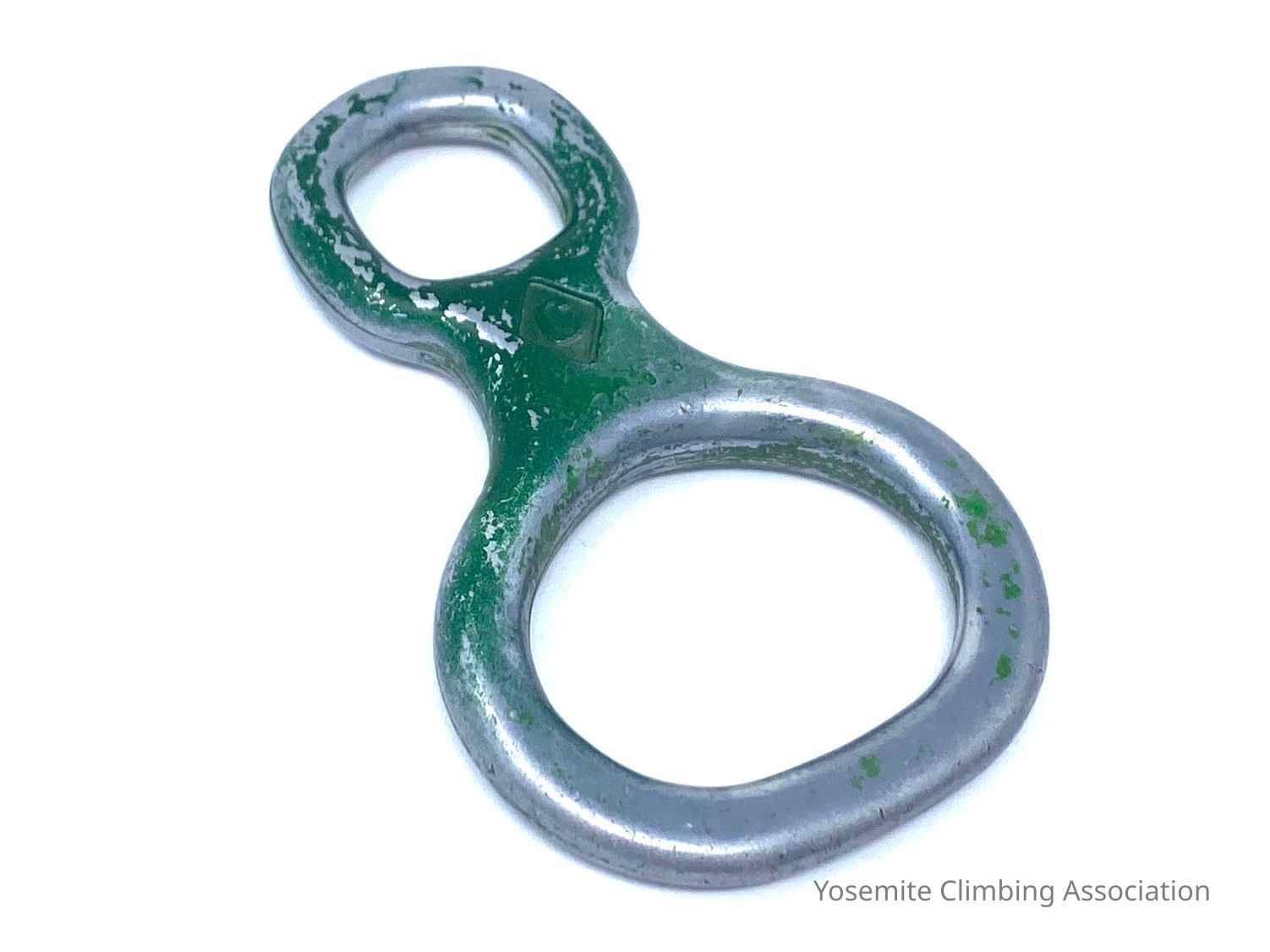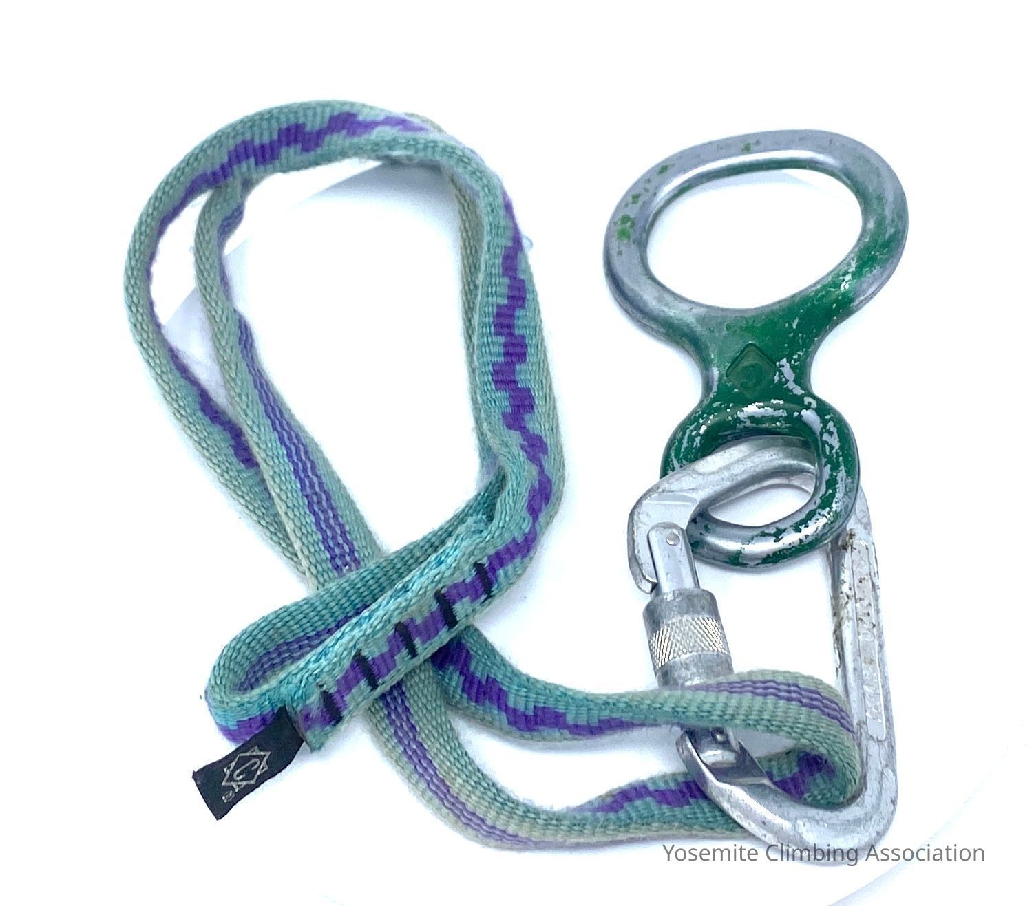 These items are in the museum's interactive display. They include a Faders manufactured locking carabiner, a Chouinard Figure 8 belay and rappel device, and a Chouinard sling. The figure 8 includes the initials "KY" from Ken Yager's personal gear.Collection